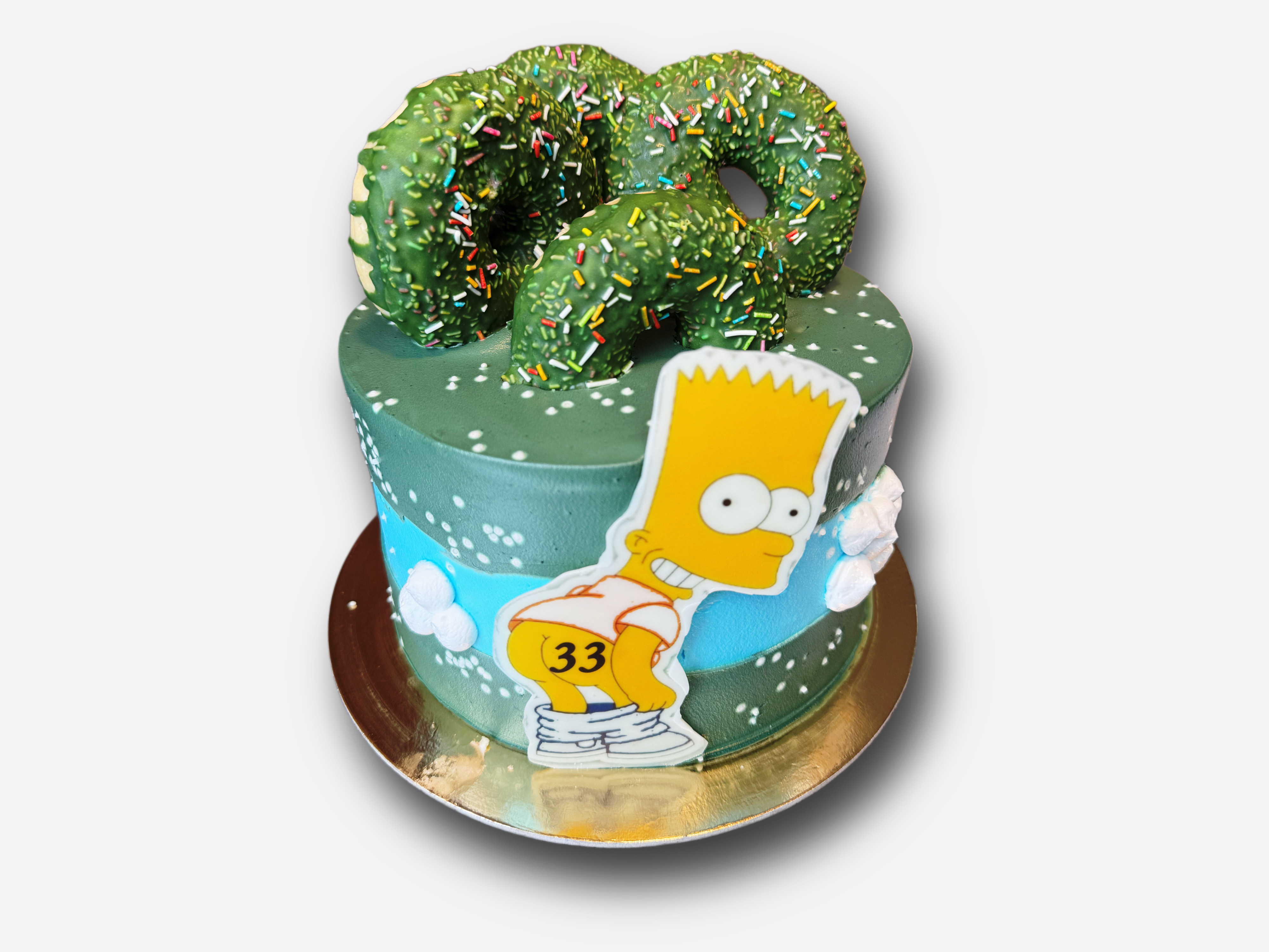 " Bartowy Psikus "  to zabawny tort inspirowany postacią Barta Simpsona, który niezmiennie rozbraja swoim urokiem. Na torcie dumnie prezentuje się Bart w swojej kultowej pozie, a jego numer - 33 - może zostać dostosowany do wieku solenizanta. Całość wieńczą zielone donuty z posypką, które nie tylko przyciągają wzrok, ale też doskonale smakują. Dekoracja utrzymana w komiksowym stylu z lekkim przymrużeniem oka idealny na urodziny, wieczory kawalerskie, imprezy tematyczne.
