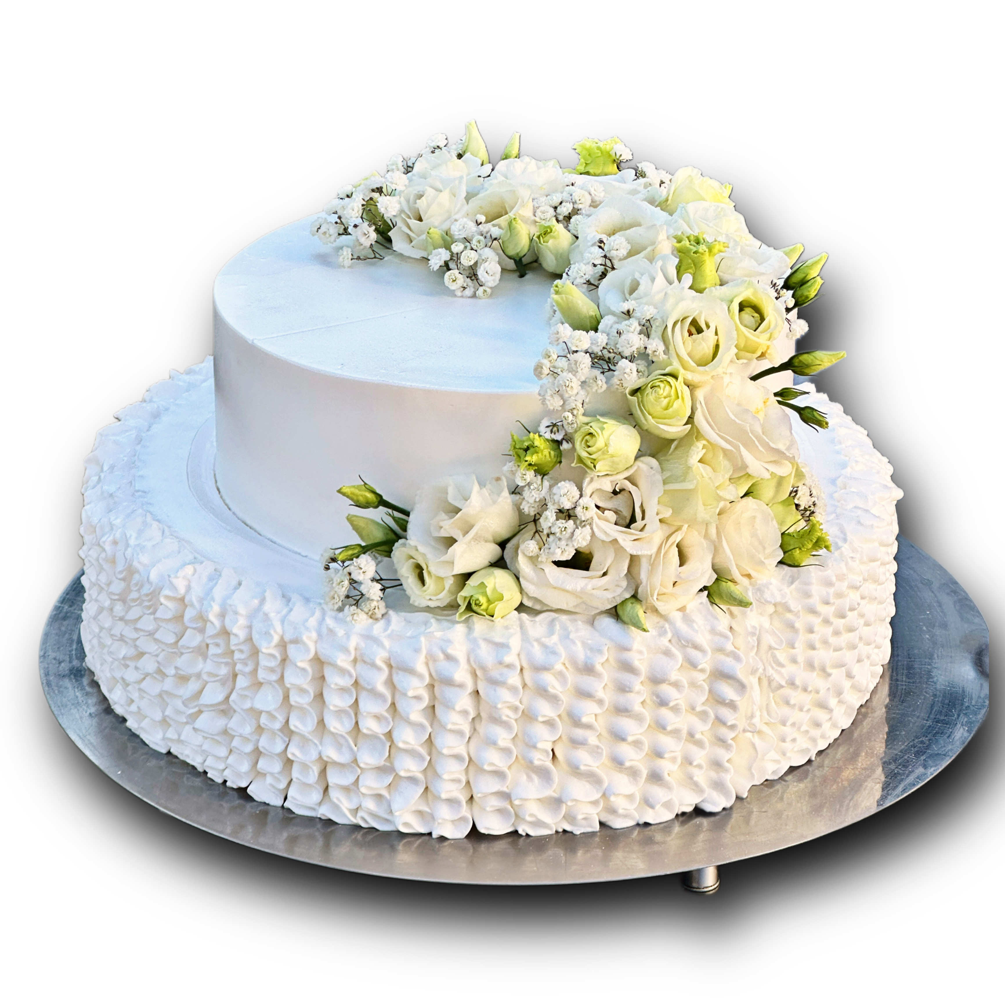 Delikatne białe kwiaty i subtelne ,koronkowe wykończenie kremu nadają mu klasyczny , romantyczny charakter , idealny na ślub lub eleganckie przyjęcie.
