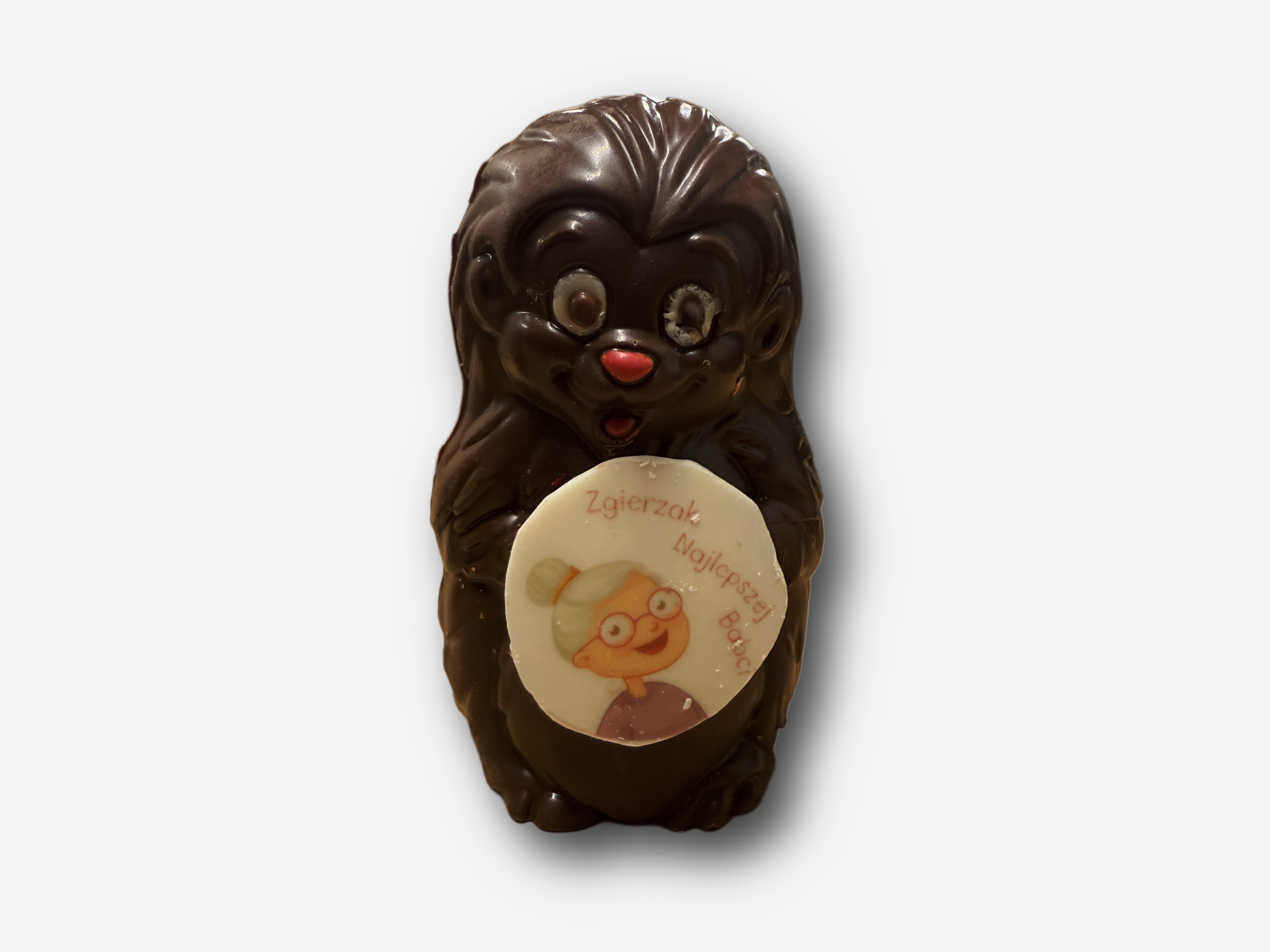 Urocza figurka jeża wykonana w całości z czekolady, przygotowana specjalnie na Dzień Babci. Jeżyk trzyma w łapkach czekoladowych krążek z kolorowym nadrukiem przedstawiającym Babcię, co nadaje figurce wyjątkowego i sentymentalnego charakteru. Starannie wykonane detale oraz wysoka jakość czekolady sprawiają, że figurka jest nie tylko smacznym, ale i pięknym upominkiem. To idealny wybór na Dzień Babci jako słodki prezent, dodatek do zestawu upominkowego lub wyjątkowa niespodzianka, która wywoła uśmiech i wzruszenie. Produkt wykonany z wysokiej jakości czekolady.