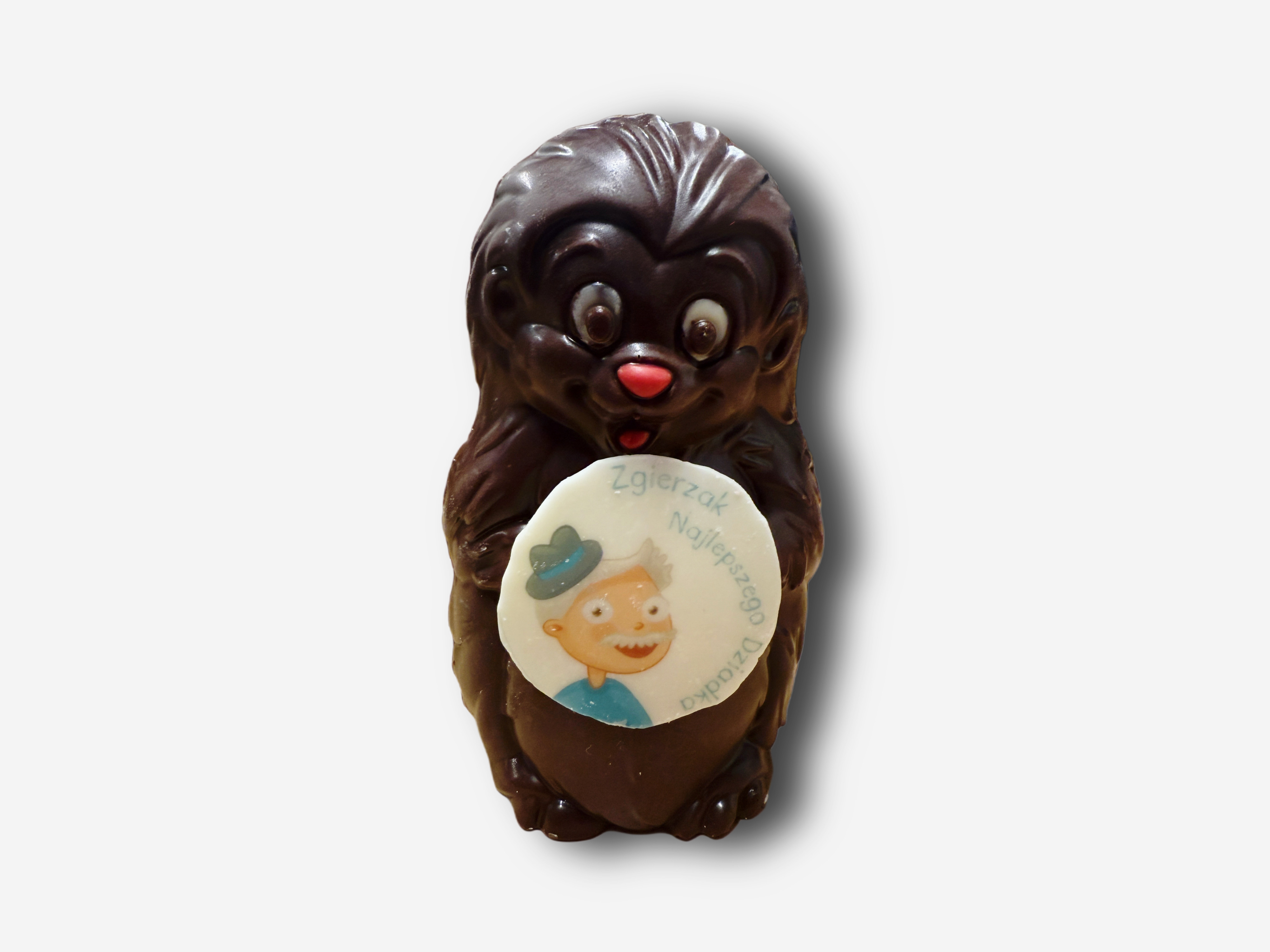 Urocza figurka jeża wykonana w całości z czekolady, stworzona specjalnie z myślą o Dniu Dziadka. Jeżyk trzyma w łapkach czekoladowy krążek z kolorowym nadrukiem przedstawiający dziadka, co nadaje figurce wyjątkowego, personalnego charakteru. Starannie wykonane detale oraz wysoka jakość czekolady sprawiają, że figurka jest nie tylko smacznym, ale i pięknym upominkiem. To idealny wybór na Dzień Dziadka jako słodki prezent, dodatek do zestawu upominkowego lub wyjątkowa niespodzianka, która wywoła uśmiech i wzruszenie. Produkt wykonany z wysokiej jakości czekolady.