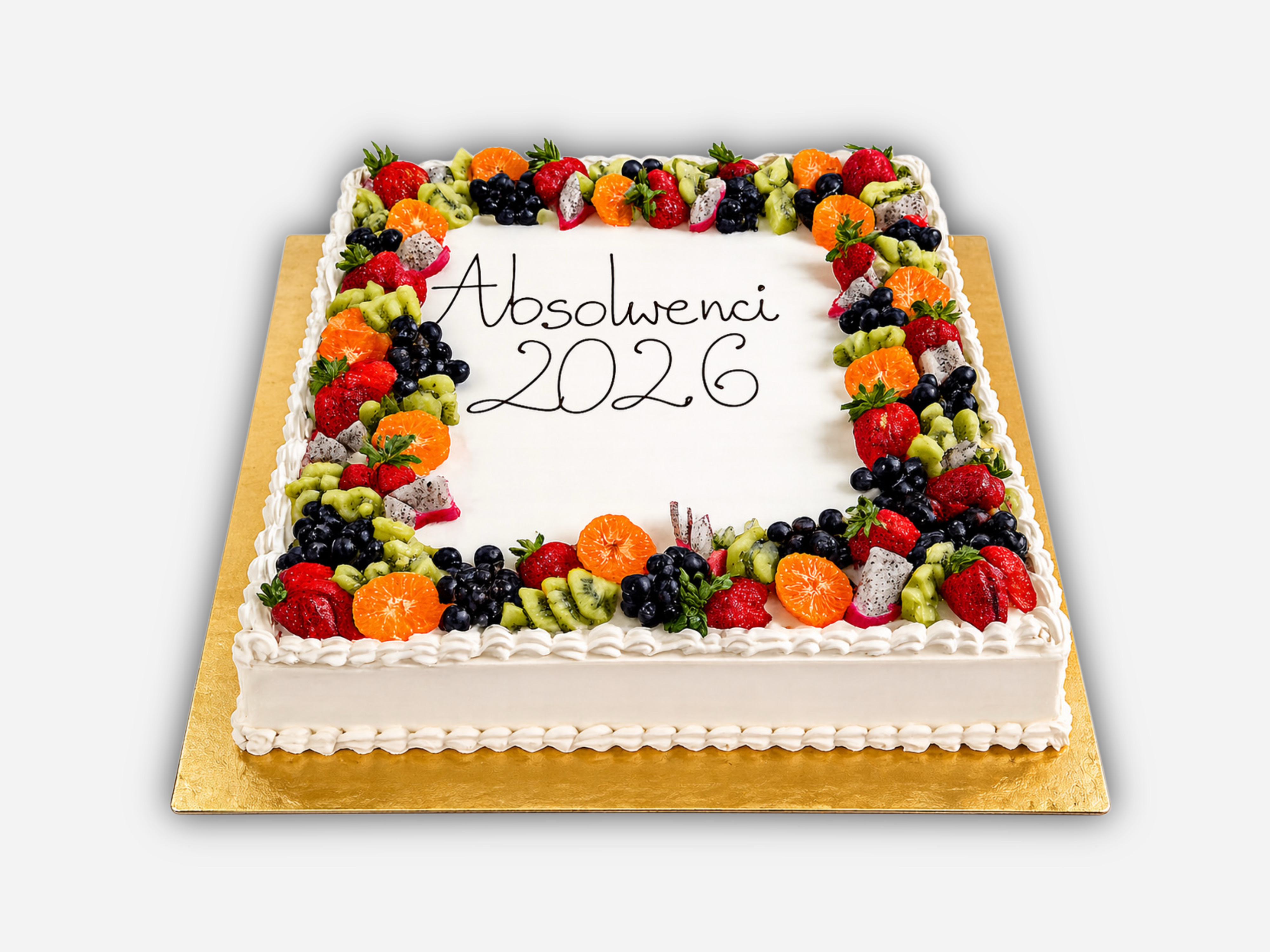 Elegancki tort firmowy o klasycznej, prostokątnej formie, stworzony z myślą o wyjątkowych okazjach biznesowych, jubileuszach oraz wydarzeniach okolicznościowych. Jasna, gładka powierzchnia tortu stanowi idealne tło dla indywidualnych napisów lub dedykacji. Całość otacza bogata kompozycja świeżych owoców - soczystych truskawek, borówek, kiwi oraz cytrusowych akcentów - które nadają tortowi lekkości, świeżości i naturalnej elegancji. Starannie wykończone detale oraz harmonijne połączenie kolorów sprawiają, że tort prezentuje się wyjątkowo estetycznie i profesjonalnie.