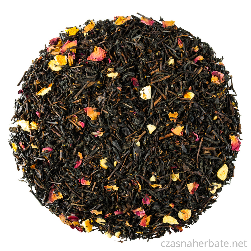 Składniki: herbata czarna OP, skórka pomarańczowa suszona, mandarynka liofilizowana 2%, płatki róży, aromaty