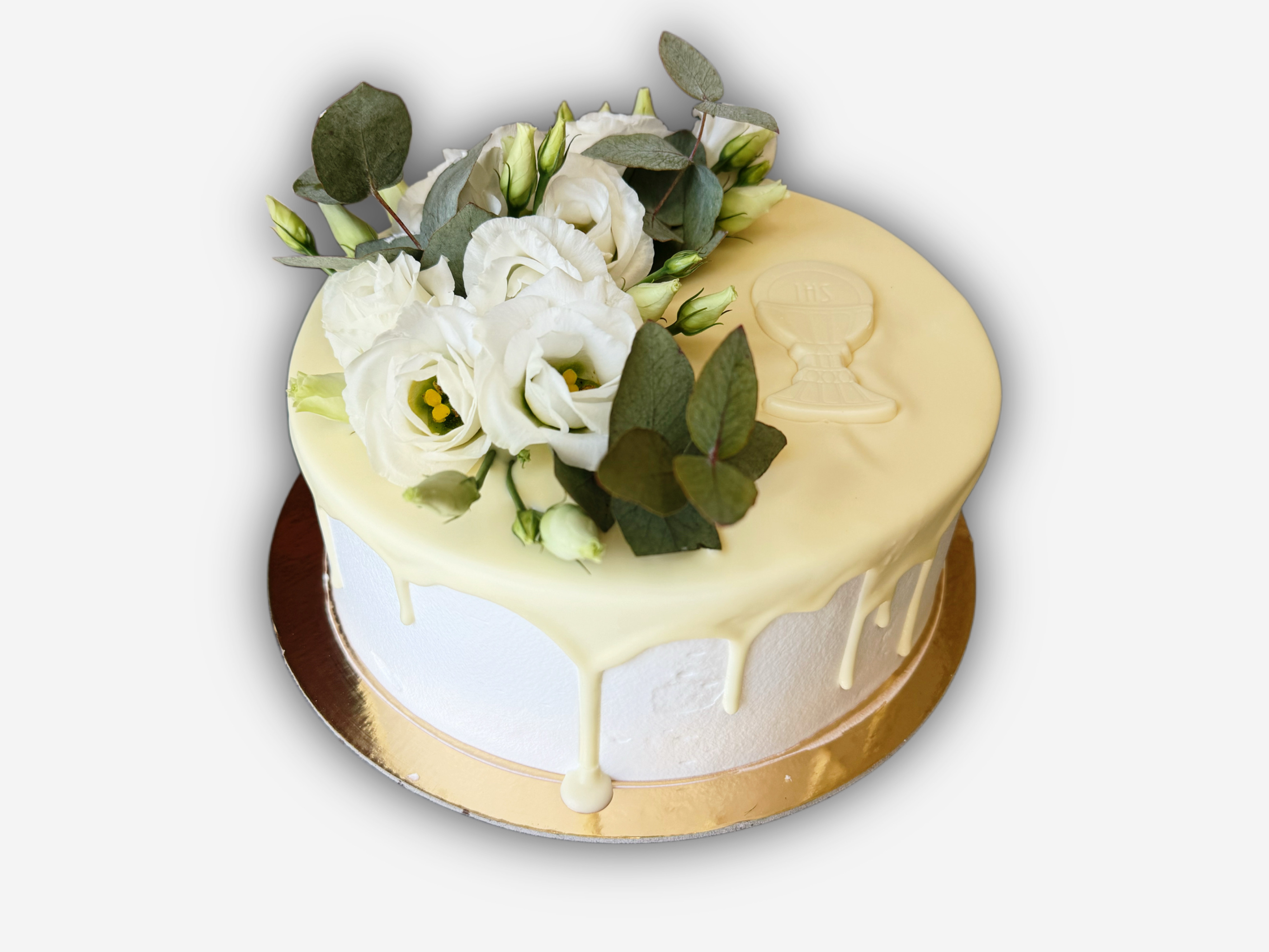 Tort komunijny z dripem z białej czekolady, świeżymi kwiatami i dekoracja formie hostii. Nowoczesna elegancja na Pierwszą Komunię Świętą.