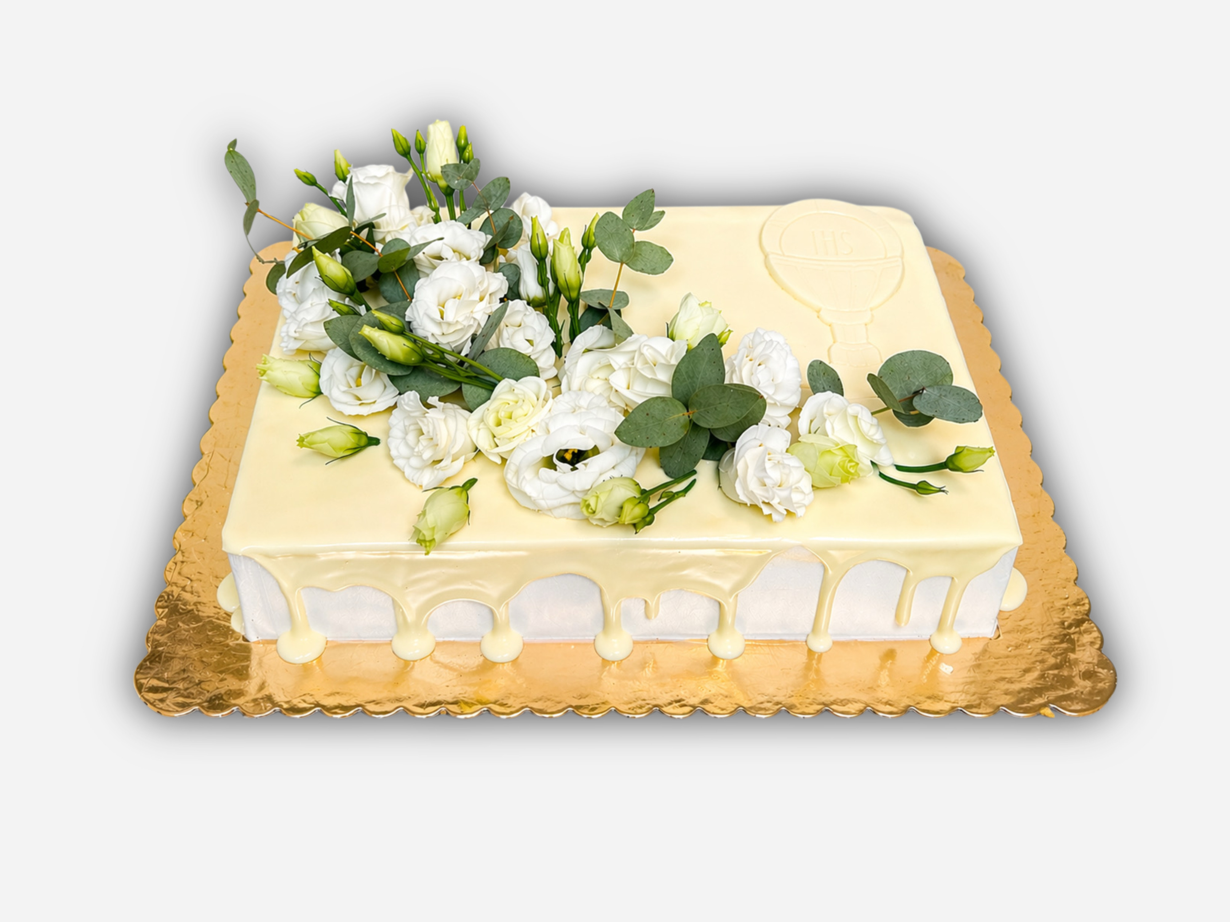 Tort komunijny z dripem z białej czekolady, świeżymi kwiatami i dekoracja formie hostii. Nowoczesna elegancja na Pierwszą Komunię Świętą.