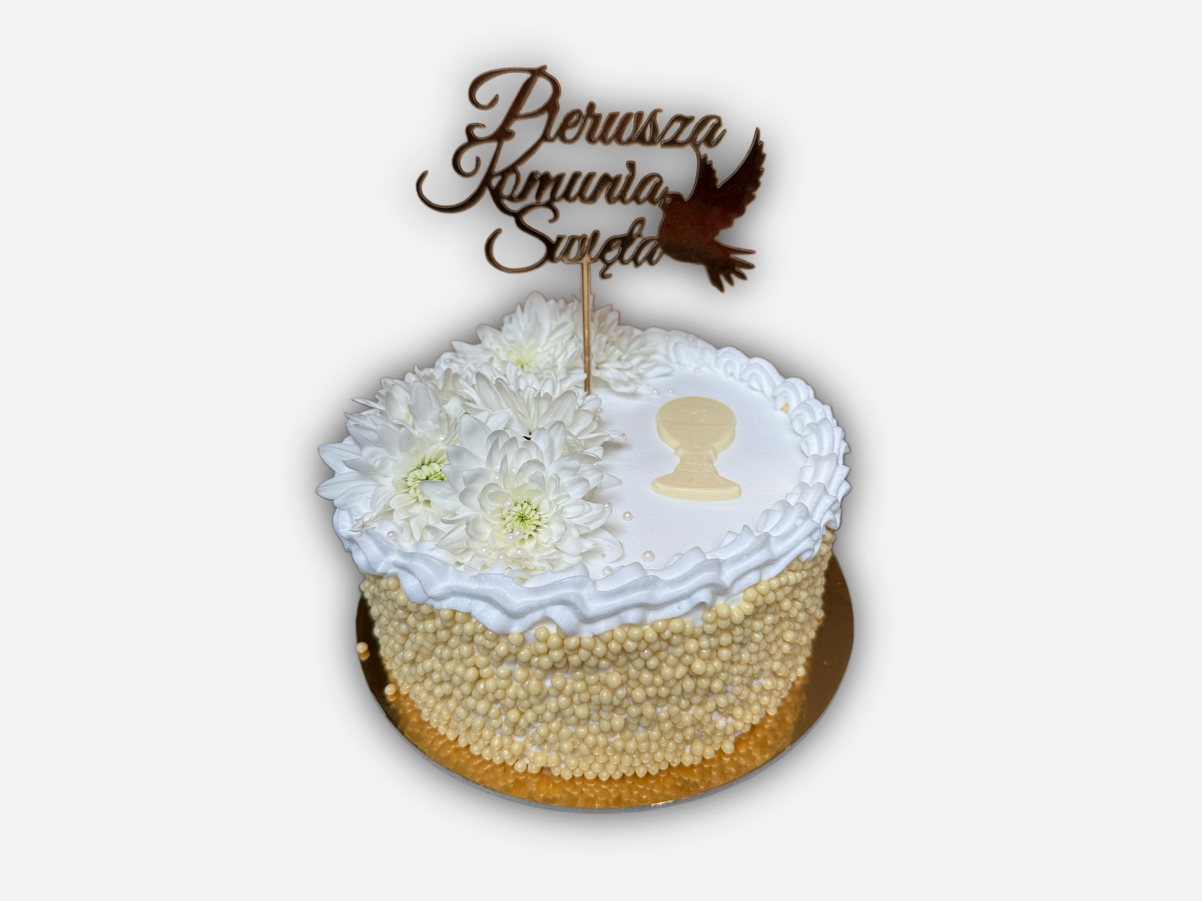 Delikatny tort komunijny utrzymany w jasnej, subtelnej kolorystyce. Udekorowany białymi kwiatami, które podkreślają jego wyjątkowy, uroczy charakter. Centralnym elementem jest hostia, nadająca całości sakralnej elegancji. Idealny wybór na Pierwszą Komunie Świętą.