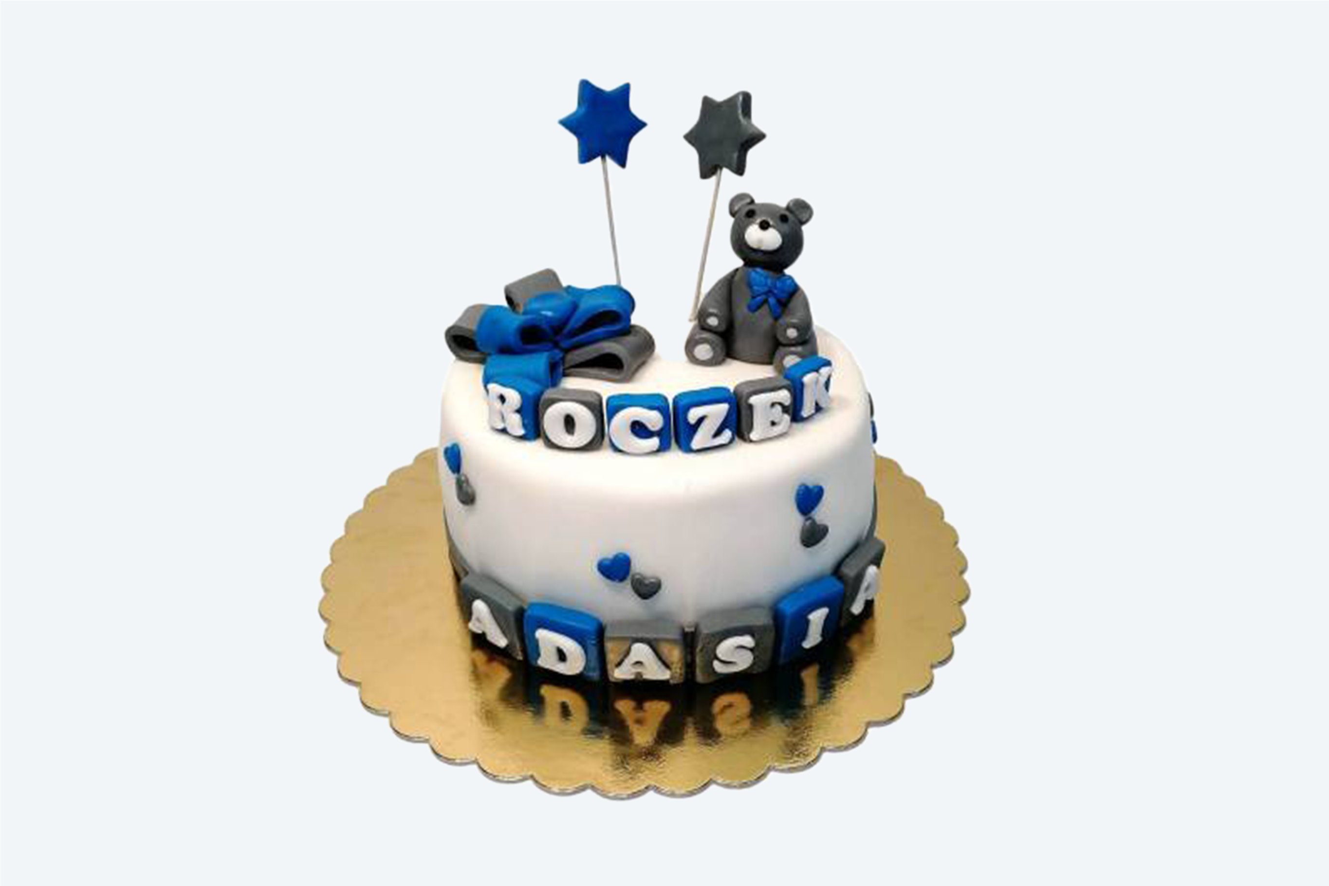 Ręcznie wykonane ozdoby i litery z masy cukrowej dla fanów misia. Pyszny śmietanowy tort z dodatkami do wyboru.