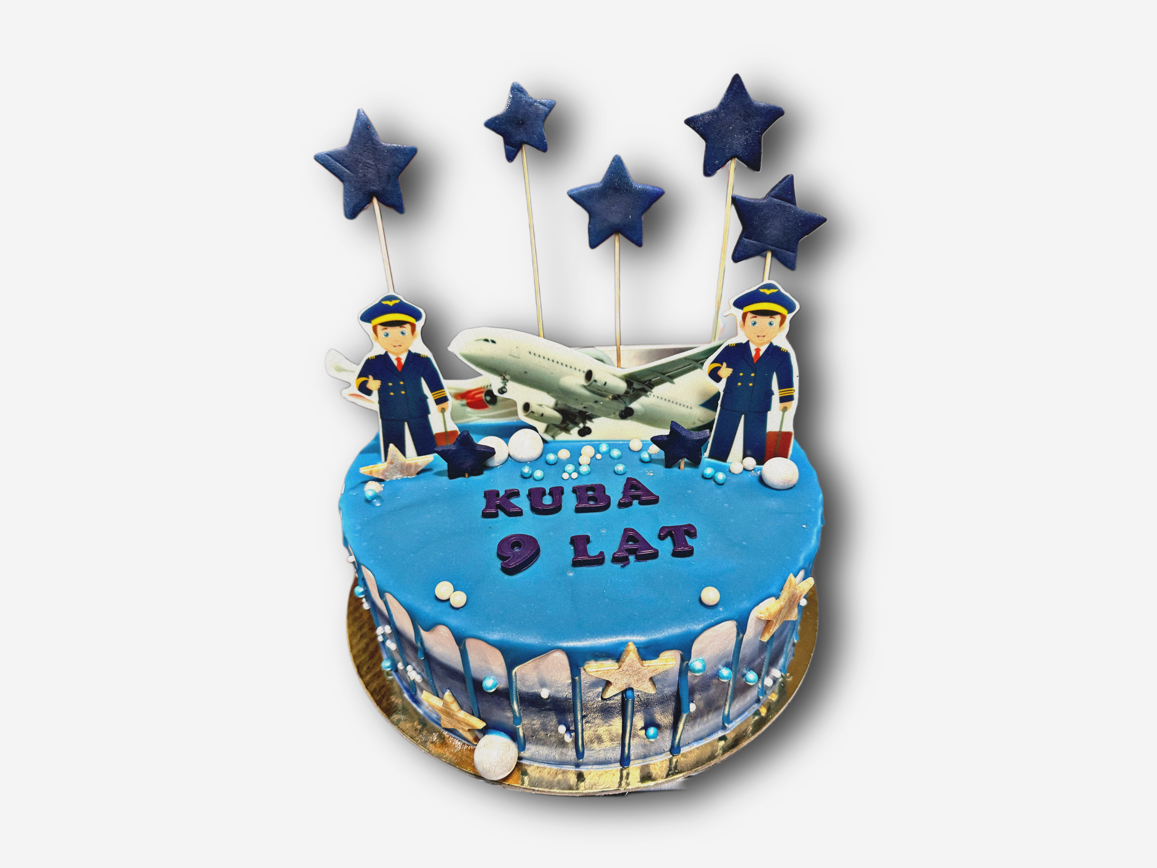 Efektowny tort w lotniczym stylu z samolotem, pilotami i gwiazdkami unoszącymi się nad tortem. Niebieska kolorystyka , personalizowany napis tworzą idealną propozycję dla małego fana lotnictwa i marzyciela ,który celuje wysoko!!