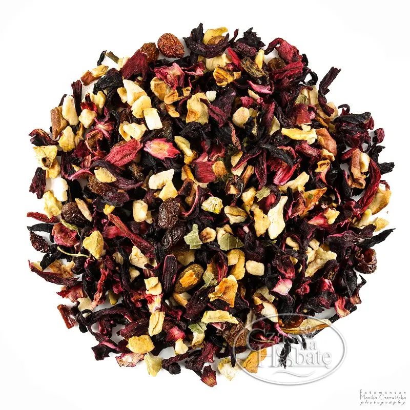 Składniki: hibiskus, jabłko, rodzynki, skórka róży, poziomka 1,5%, liść poziomki 1%, aromat