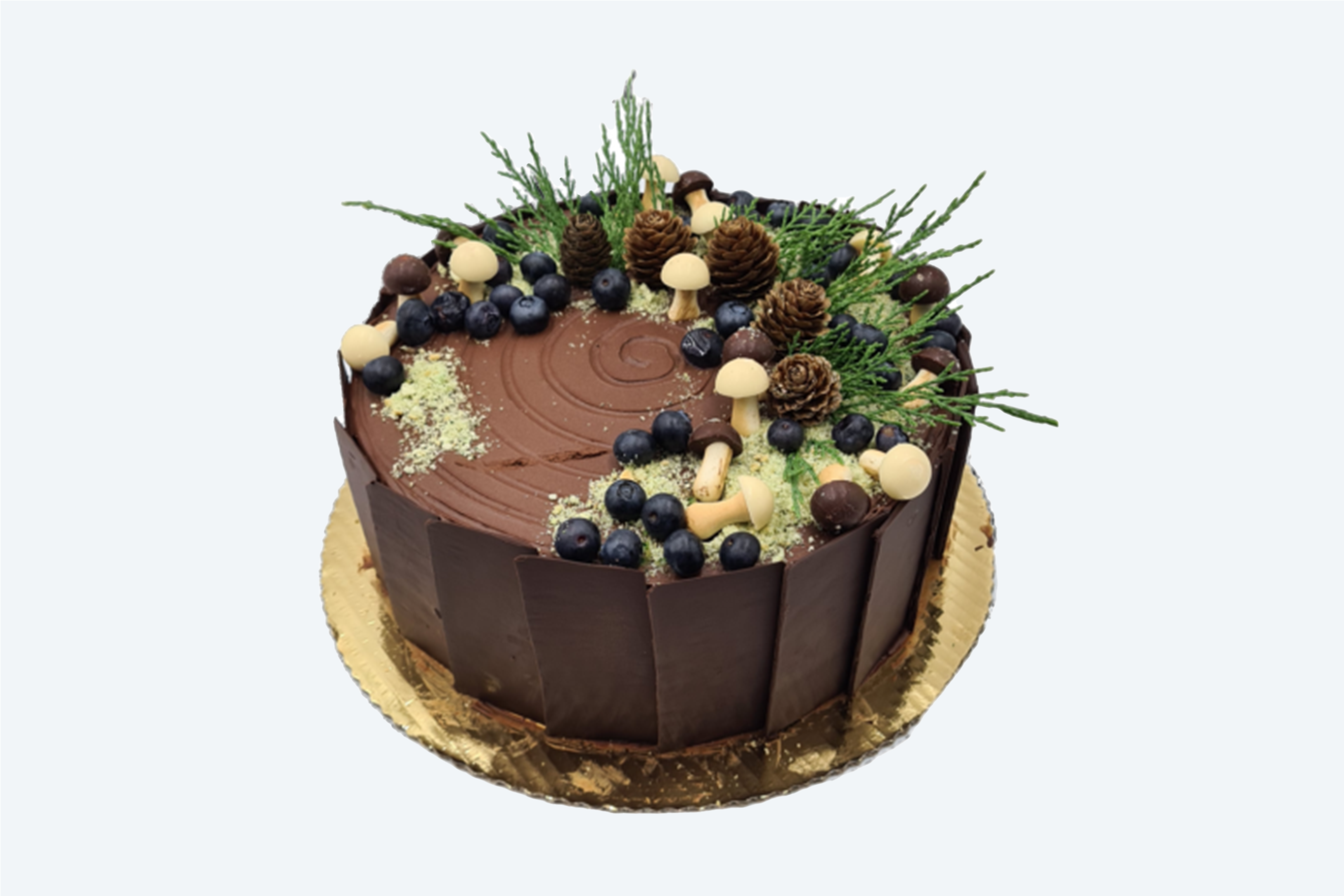 Na zewnątrz palisada z czekolady, a na wierzchu ozdoby z duchem lasu. Grzybki z masy cukrowej a wokół jagody, szyszki i mech. W środku delikatna bita śmietana i orzeźwiające owoce. Całość uzupełnia chrupka na bazie orzechów laskowych i białej czekolady. Zapraszamy do wyboru napisu, świeczek oraz wielkości tortu.