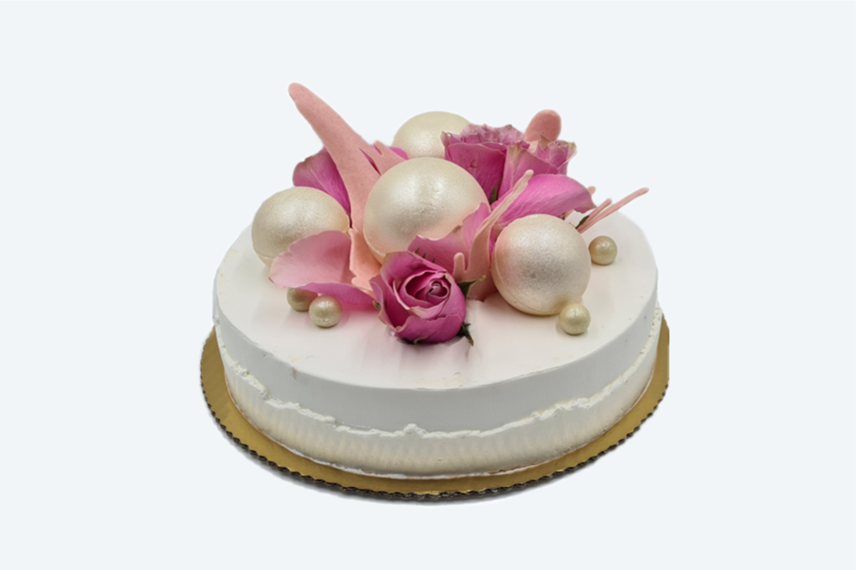 Ręcznie robione perły z białej czekolady, wykończone perłowym brokatem w towarzystwie świeżych róż. Środek tortu wypełnia czekoladowy biszkopt, chrupiąca pralina z czekolady i orzecha laskowego oraz konfitura wiśniowa.
