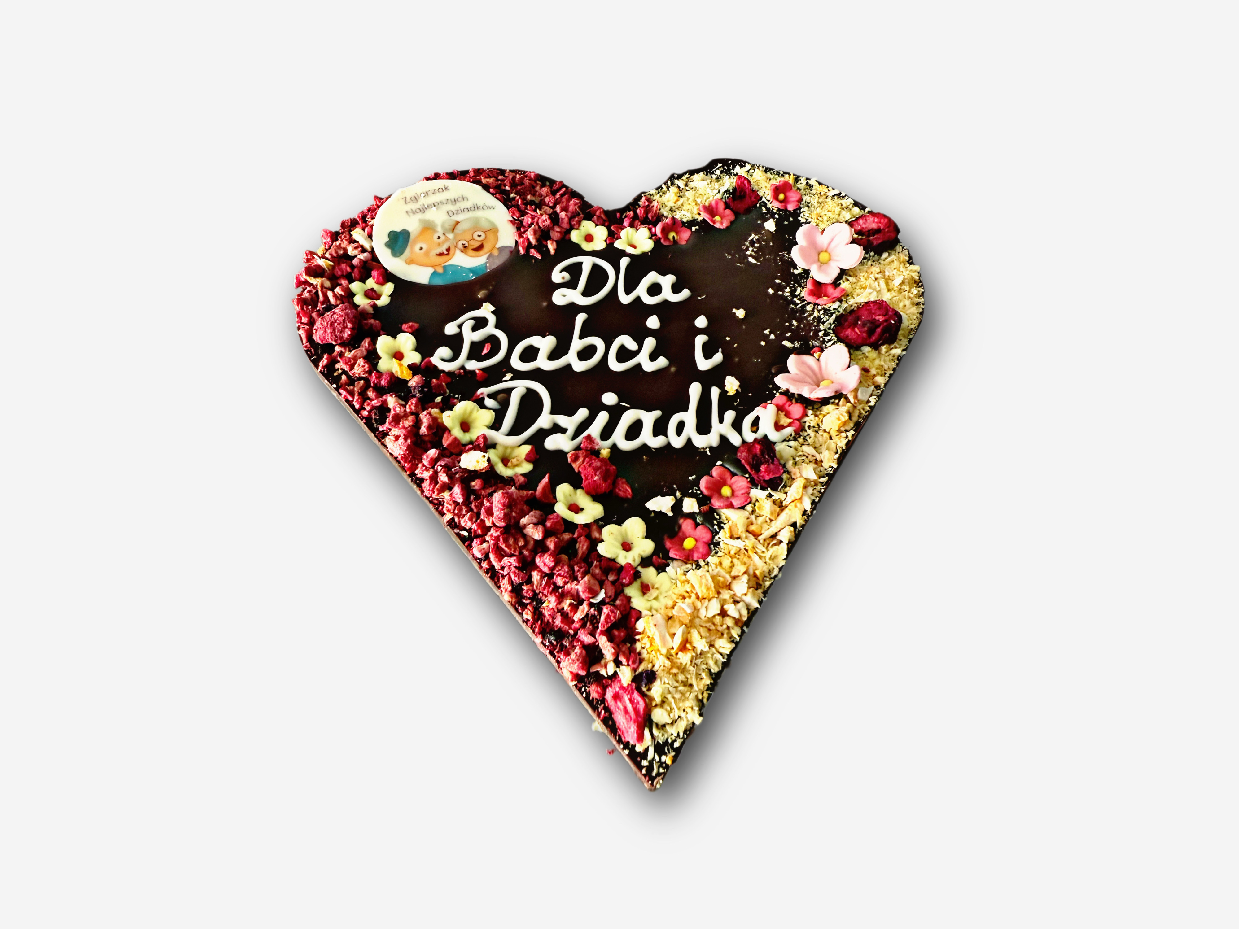 Ręcznie wykonane serce z czekolady o gramaturze 200g, przygotowane z okazji Dnia Babci i Dziadka. Czekoladowe serce dekorowane jest ręcznie naturalnymi dodatkami oraz delikatnymi cukrowymi kwiatkami, a całość uzupełnia elegancki napis " Dla Babci i Dziadka ", wykonany z czekolady. Staranie dobrana, kwiatowa dekoracja nadaje sercowi wyjątkowy i ciepły charakter, czyniąc go idealnym słodkim upominkiem dla ukochanych dziadków.