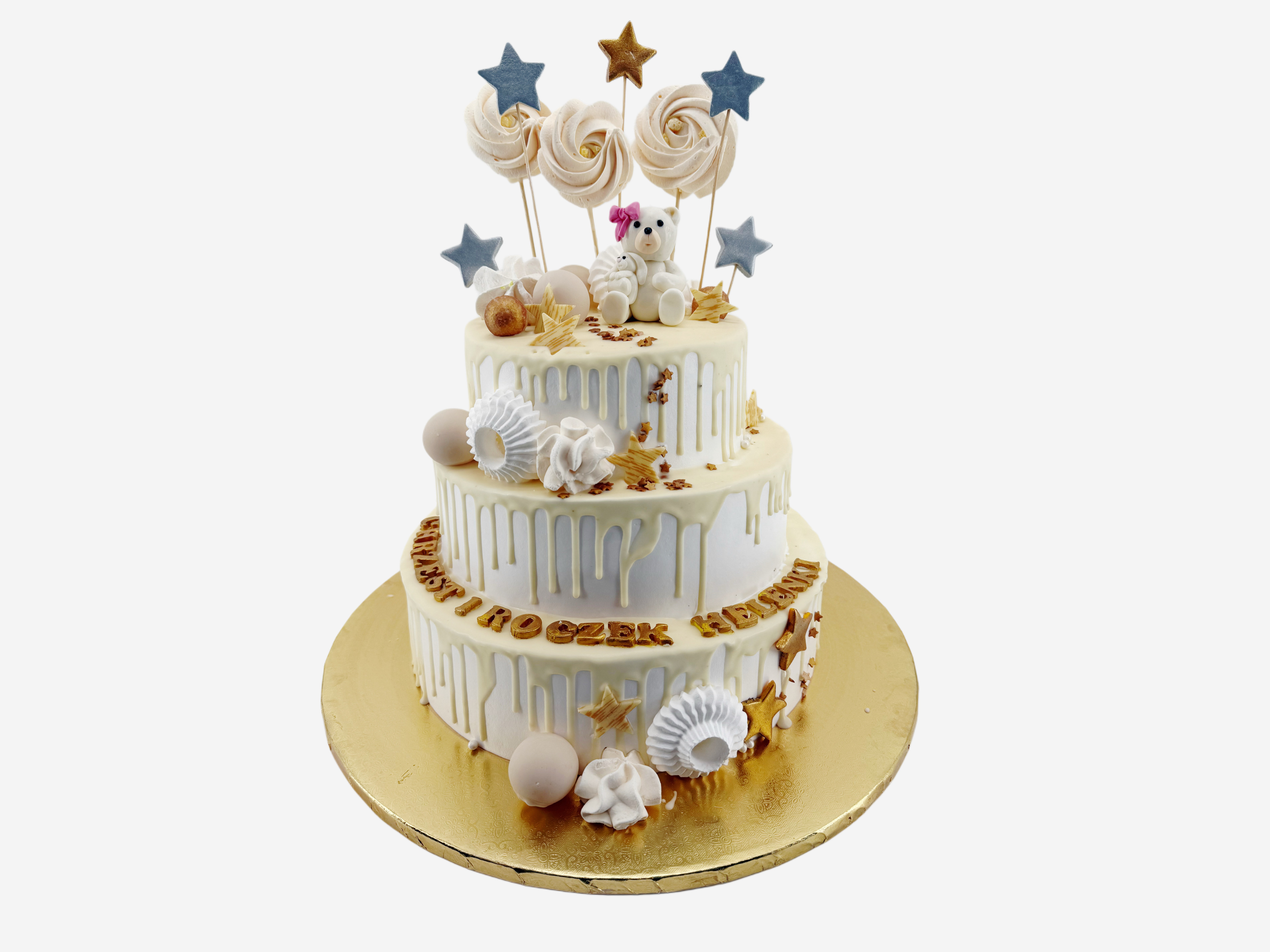 Tort piętrowy w białej kolorystyce z efektem delikatnego drip cake, ozdobiony w stylu bajkowym i eleganckim jednocześnie. Uroczy biały miś z różową kokardką siedzi centralnie, przyciągając wzrok i dodając słodyczy całej kompozycji.