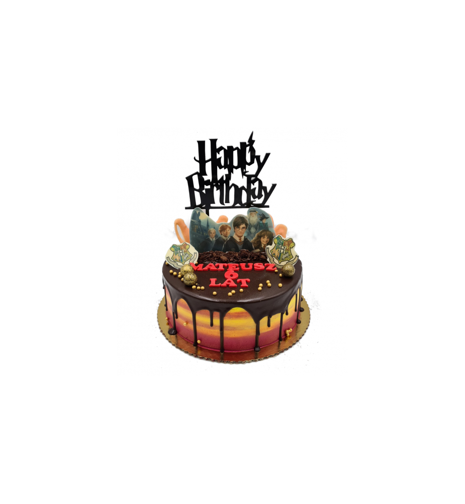 Tort dekorowany figurkami z filmu Harry Potter i spływającą po bokach czekoladą.