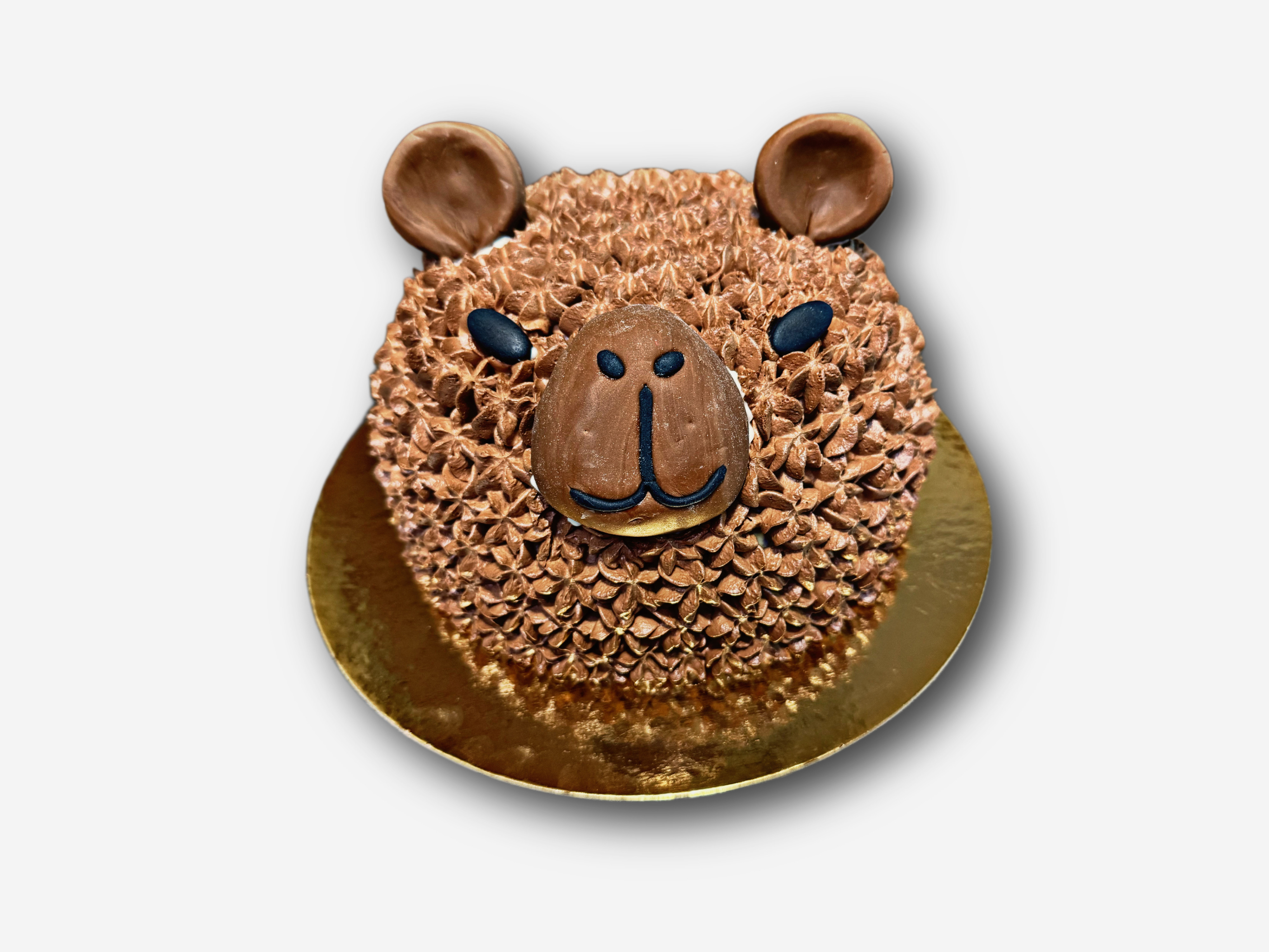 Uroczy tort w kształcie kapibary, ręcznie dekorowany z dbałością o każdy detal. Naturalna kolorystyka i sympatyczny pyszczek sprawiają, że tort idealnie sprawdzi się na urodziny dzieci oraz dla miłośników zwierzęcych motywów.