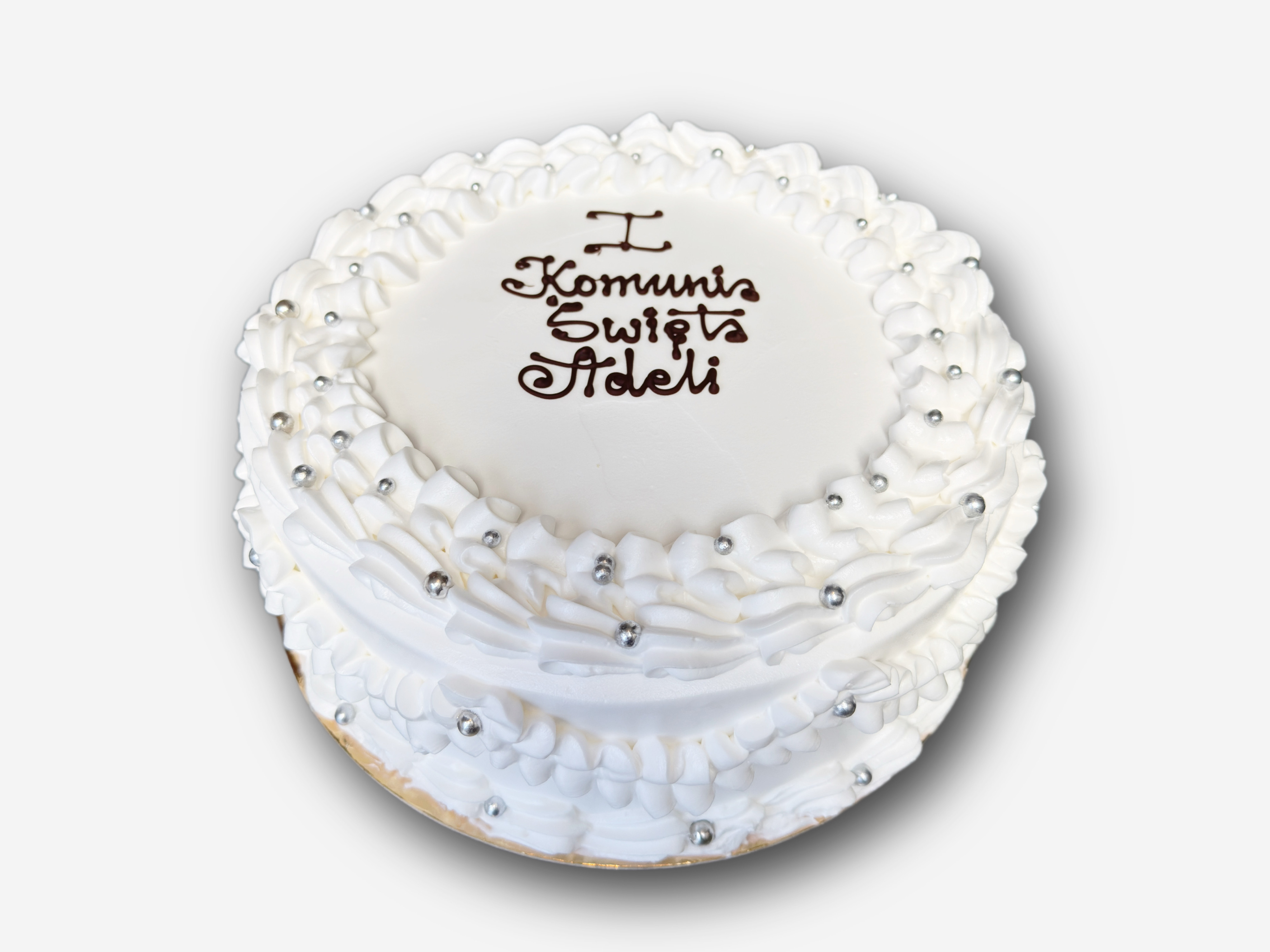 Ten niezwykle stylowy tort zachwyca precyzją wykonania i subtelną elegancją. Idealny wybór na komunię, chrzest lub elegancki jubileusz.