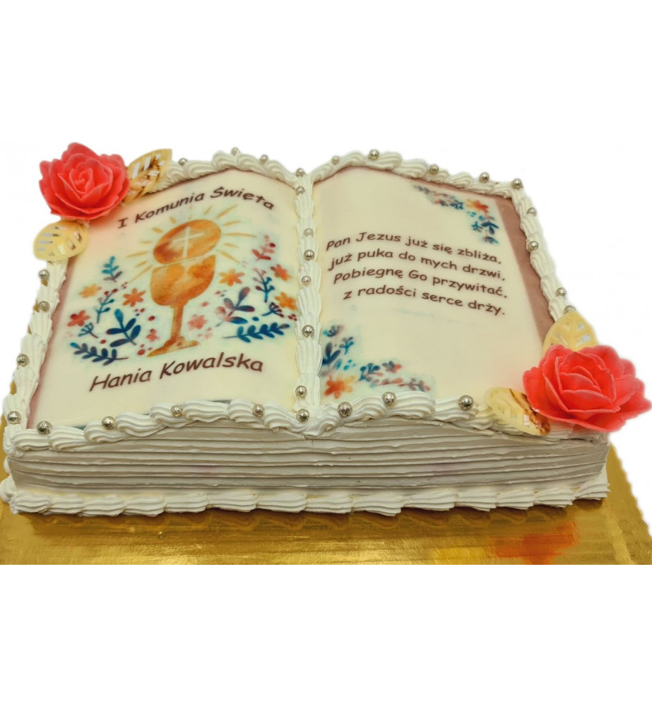 Tort w kształcie książki z grafiką o tematyce komunijnej. Tort z prawdziwej śmietany z warstwą frużeliny owocowej.