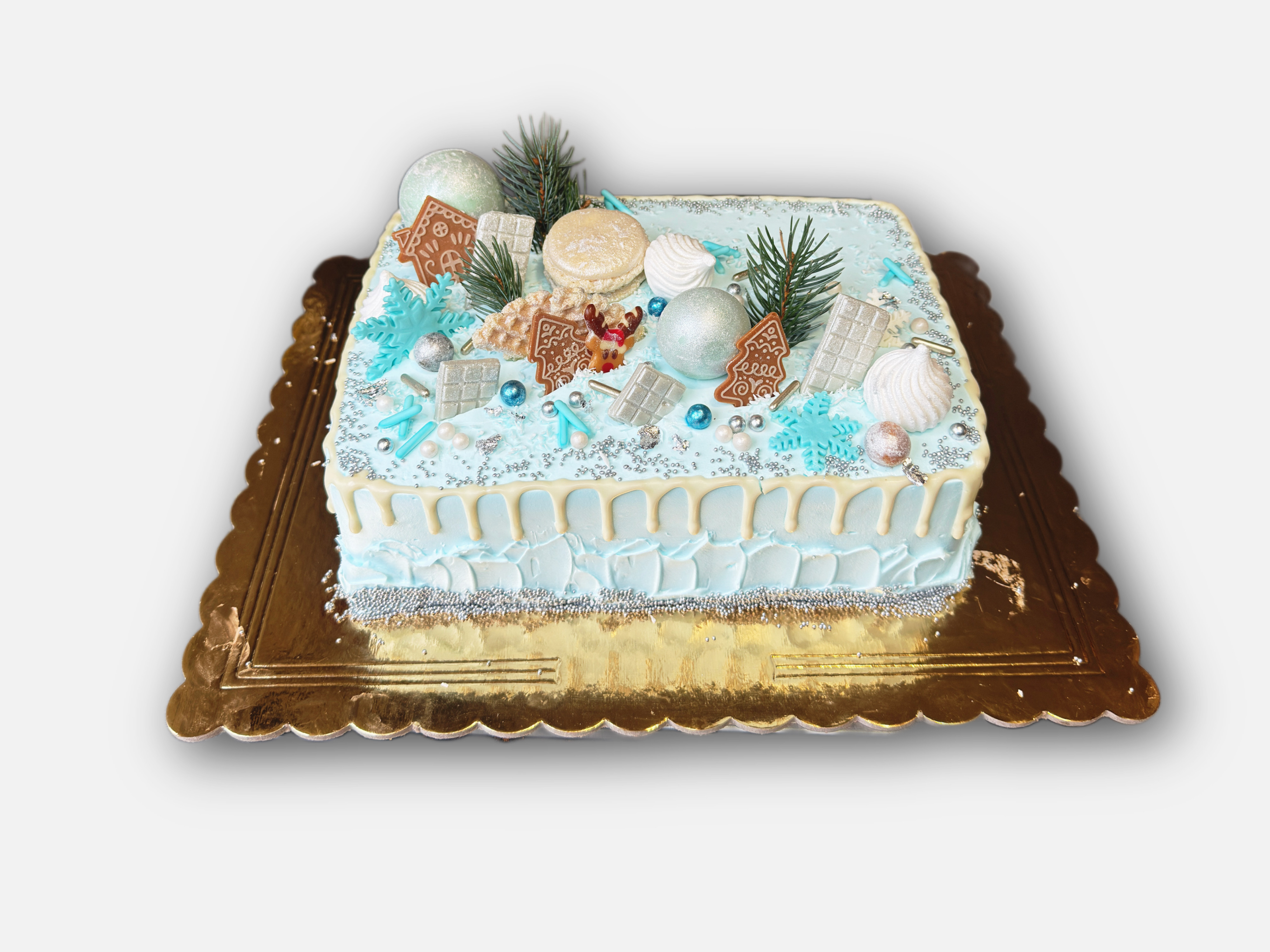 Wyjątkowy tort inspirowany zimową aurą, utrzymany w chłodnej palecie błękitu, bieli i srebra. Powierzchnia tortu wykończona jest jasnoniebieskim kremem z delikatnym, jasnym dripem, który nadaje całości nowoczesnej lekkości. Wierzch zdobią starannie wykonane dekoracje: makaroniki, bezy, połyskujące kule, czekoladowe elementy oraz pierniczki choinki. Całość uzupełniają srebrne perełki, błękitne akcenty cukrowe oraz dekoracyjne gałązki przywodzące na myśl mroźny, zimowy krajobraz. Tort doskonale sprawdzi się świątecznie przyjęcia, zimowe uroczystości oraz eleganckie spotkanie.