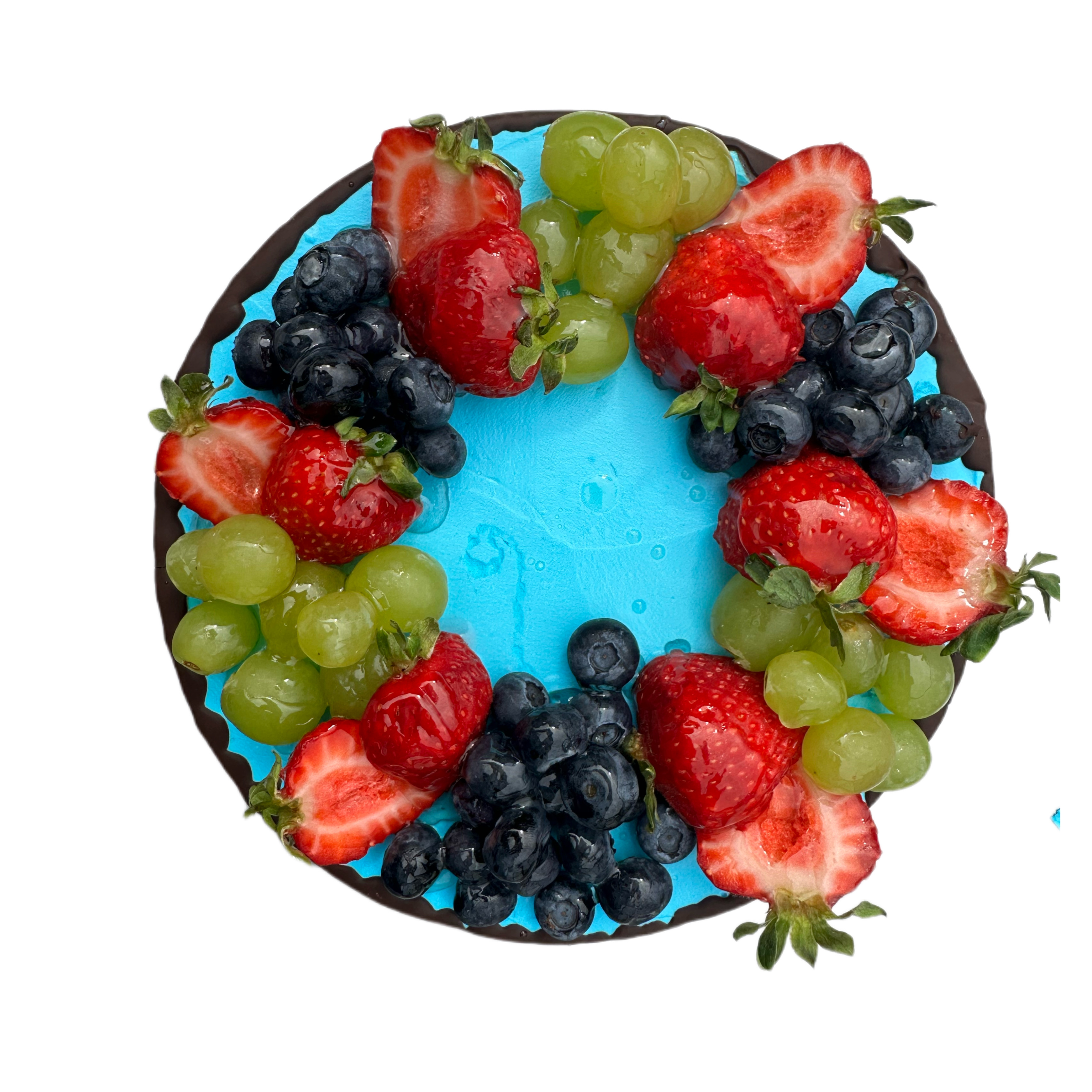 Tort niebieski dekorowany świeżymi sezonowymi owocami.