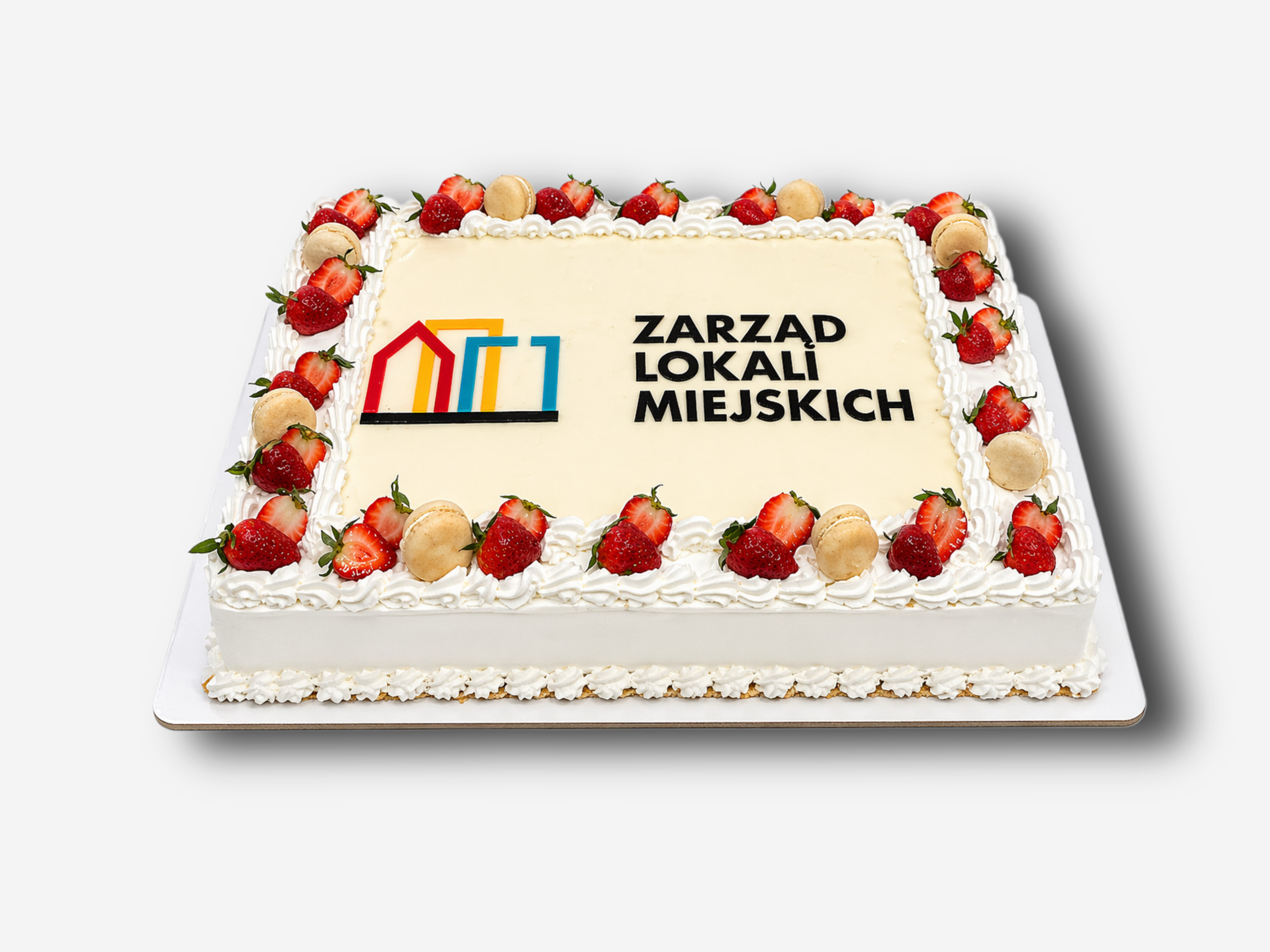 Starannie wykończony tort o gładkiej, kremowej powierzchni, udekorowany świeżymi truskawkami oraz delikatnymi makaronikami. Całość utrzymana w eleganckim, jasnym stylu, z subtelnym zdobieniem z kremem na krawędziach. Centralnym elementem jest jadalny nadruk na opłatku, który nadaje tortowi indywidualnego i wyjątkowego charakteru.