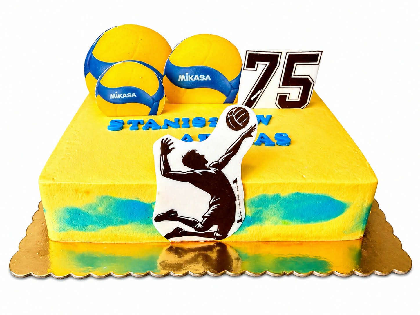 Nowoczesny tort w sportowym stylu, inspirowany pasją do siatkówki. Dekorowany piłkami, dynamiczną sylwetką zawodnika w akacji oraz okolicznościową liczbą " 75 ". Intensywne kolory i minimalistyczna forma podkreślają energię i charakter sportowego świętowania - idealny dla każdego miłośnika siatkówki.