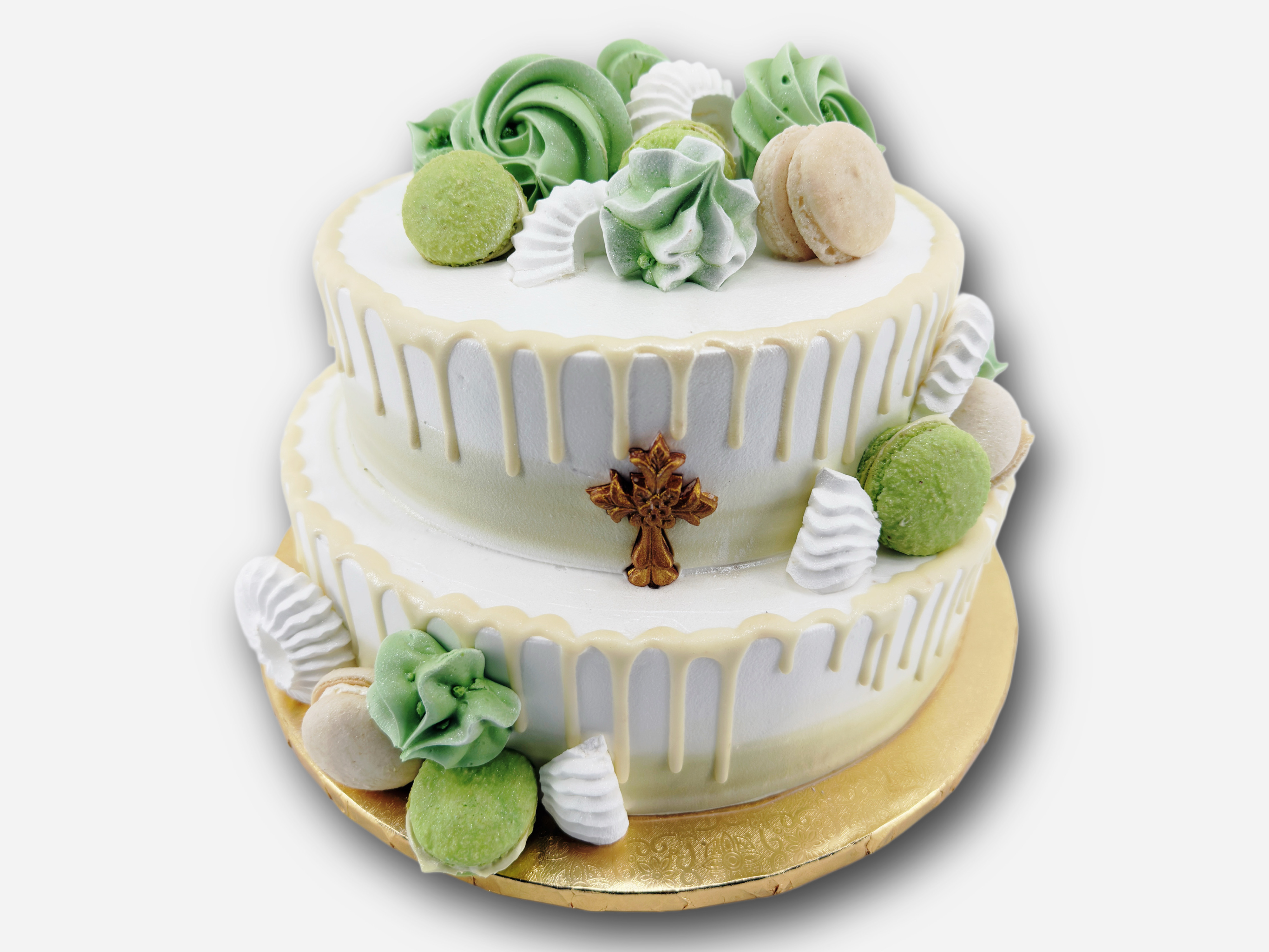 Tort dwupiętrowy, pokryty gładkim, białym kremem z delikatnym efektem drip ( spływająca polewa ). Dekoracja utrzymana jest w odcieniach zieleni, bieli co nadaje mu świeży i stylowy wygląd. Centralnym elementem dekoracyjnym jest złoty krzyż umieszczony na froncie tortu może być na chrzest lub komunię. Całość prezentuje się bardzo elegancko.