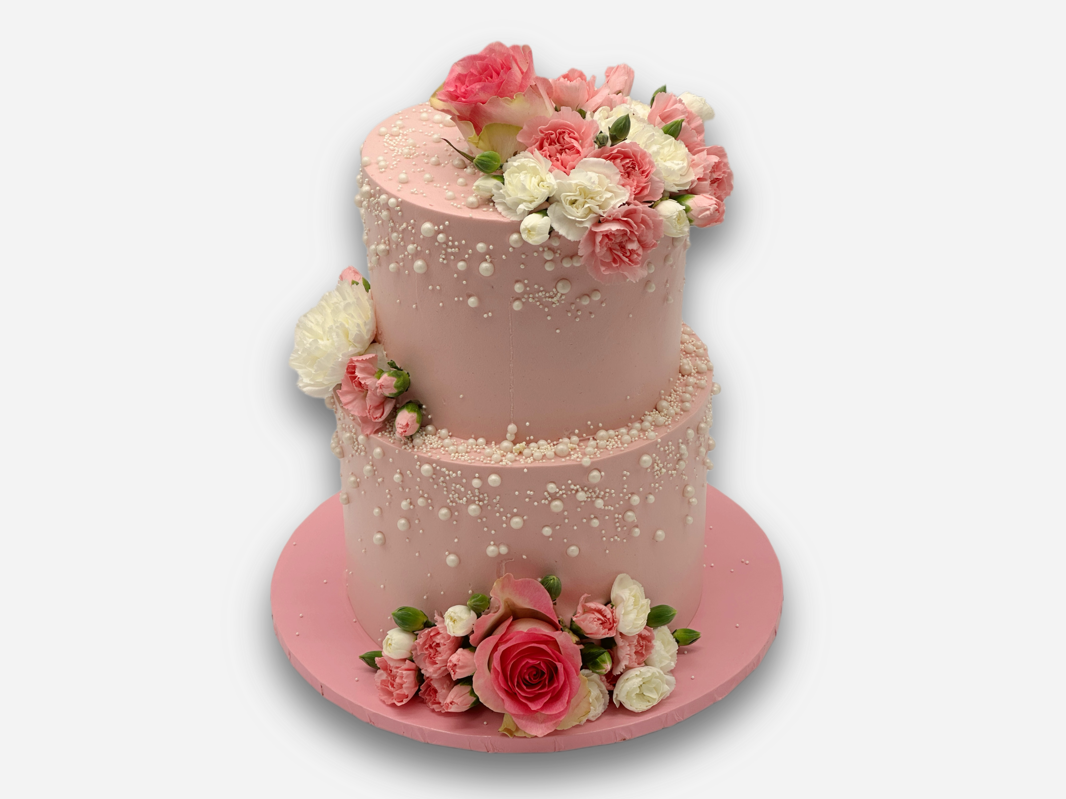 Piękny tort weselny w różowym kolorze dekorowany białymi i różowymi kwiatami posypany perełkami.