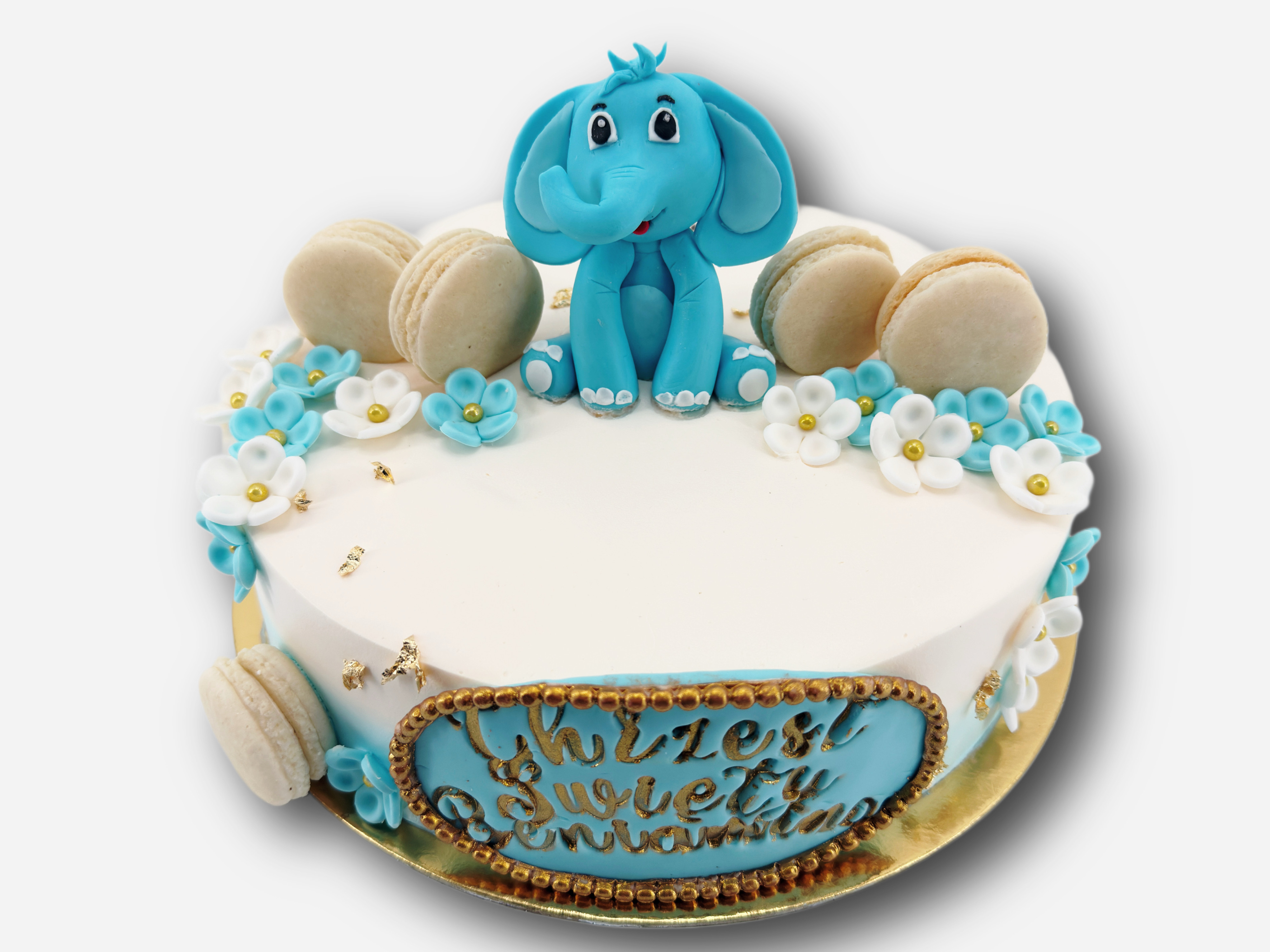 Uroczy tort na chrzest lub inne ważne wydarzenie dziecięce, ozdobiony ręcznie wykonaną figurką niebieskiego słonika z masy cukrowej. Całość utrzymana jest w delikatnej biało-niebieskiej kolorystyce z akcentami złota. Tort udekorowany jest eleganckimi makaronikami, cukrowymi kwiatkami oraz złotymi perełkami. Idealny na chrzest, roczek, baby shower lub urodziny dziecka.