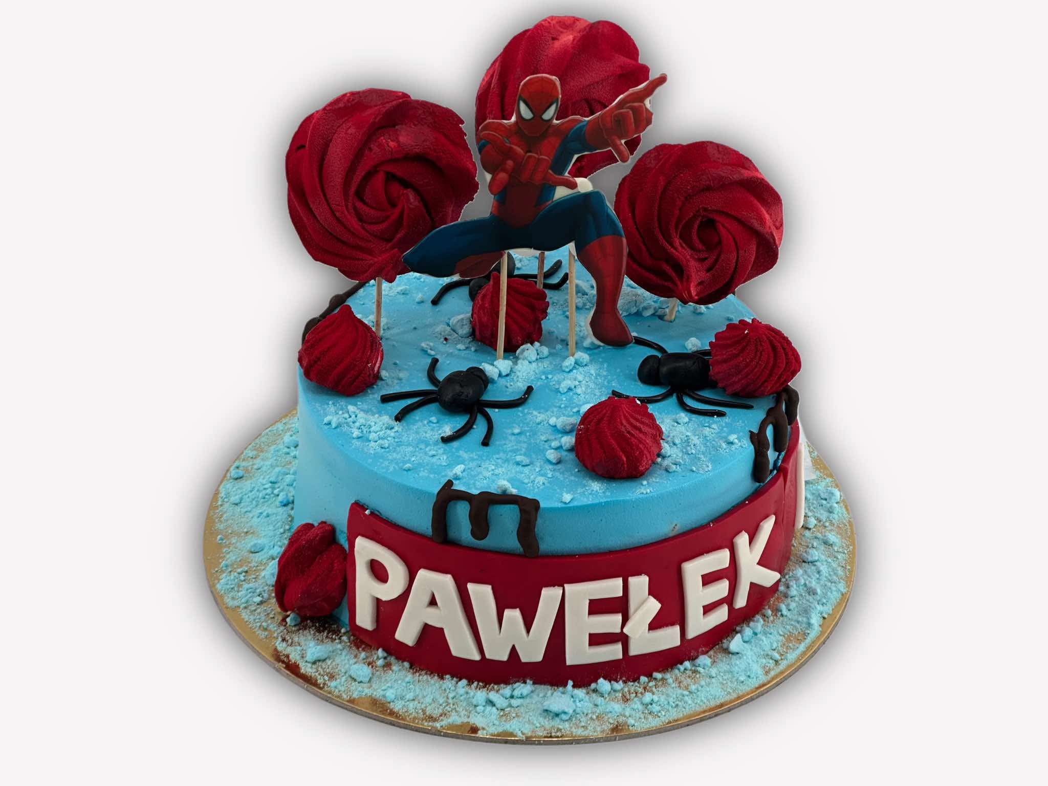 Tort dekorowany figurką Spider Man. Figurki wydrukowane na białej czekoladzie.