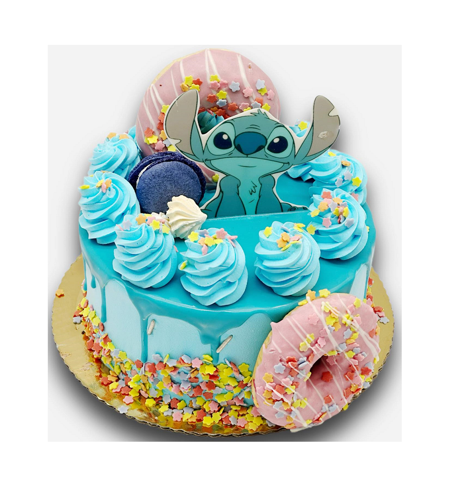 Tort dekorowany figurką Stich. Figurka wydrukowane na białej czekoladzie. Całości jest ozdobiona różowymi donatami, które tworzą niepowtarzalną kompozycję kolorów i smaków.