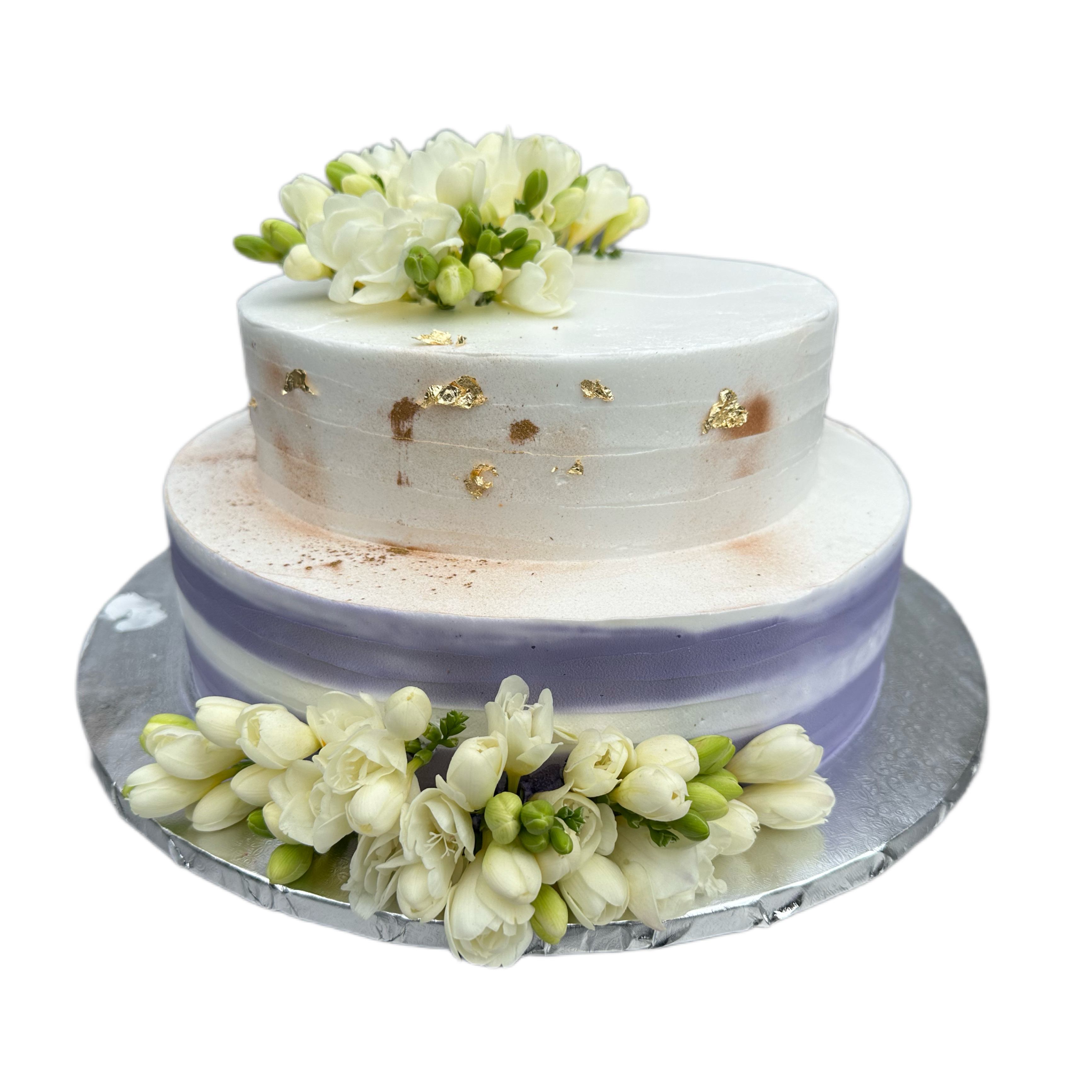 Tort o biało - fioletowej kolorystyce dekorowany sezonowymi kwiatami.