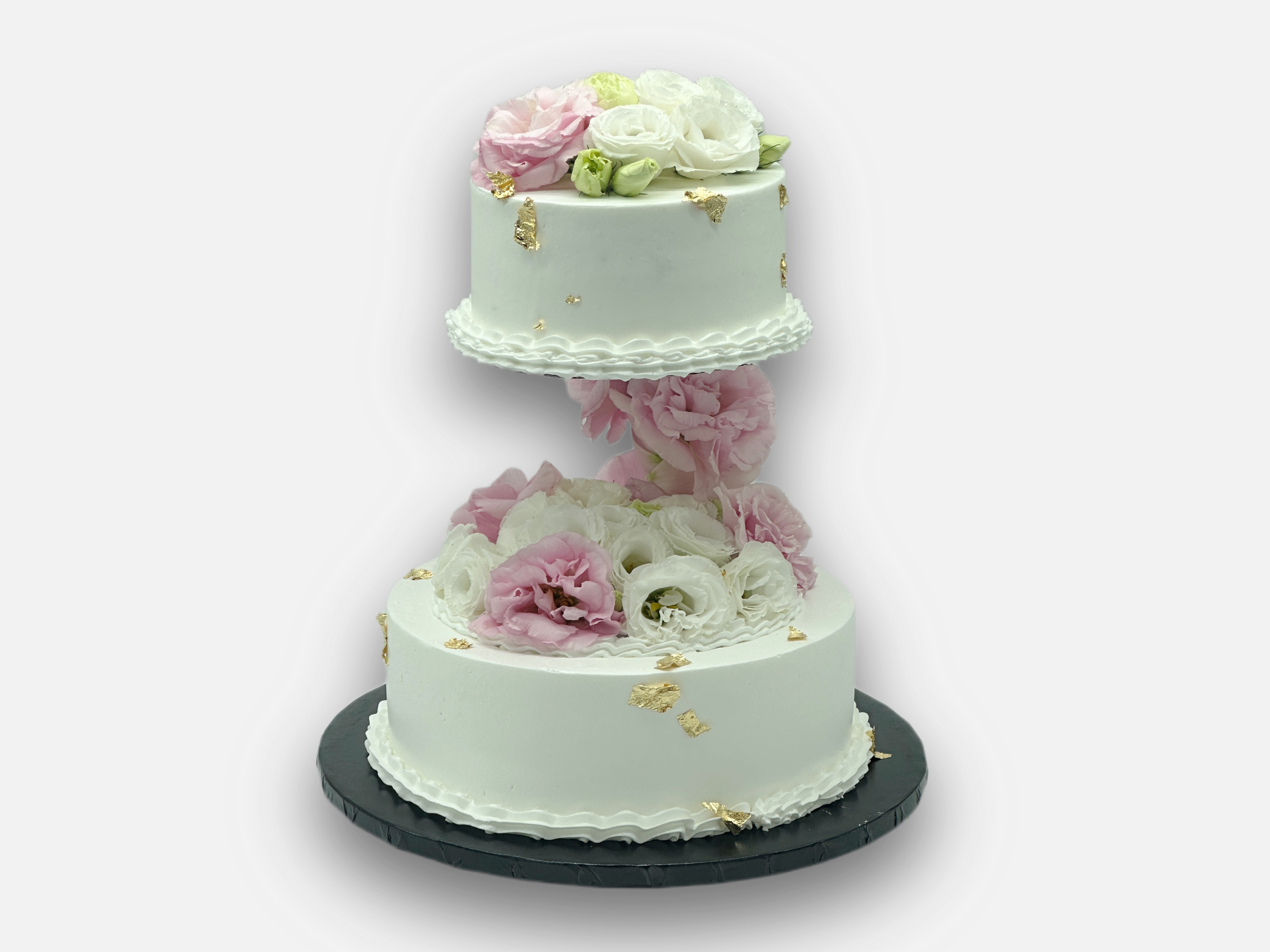 Piękny tort w biało różowej tonacji z żywymi kwiatami.
