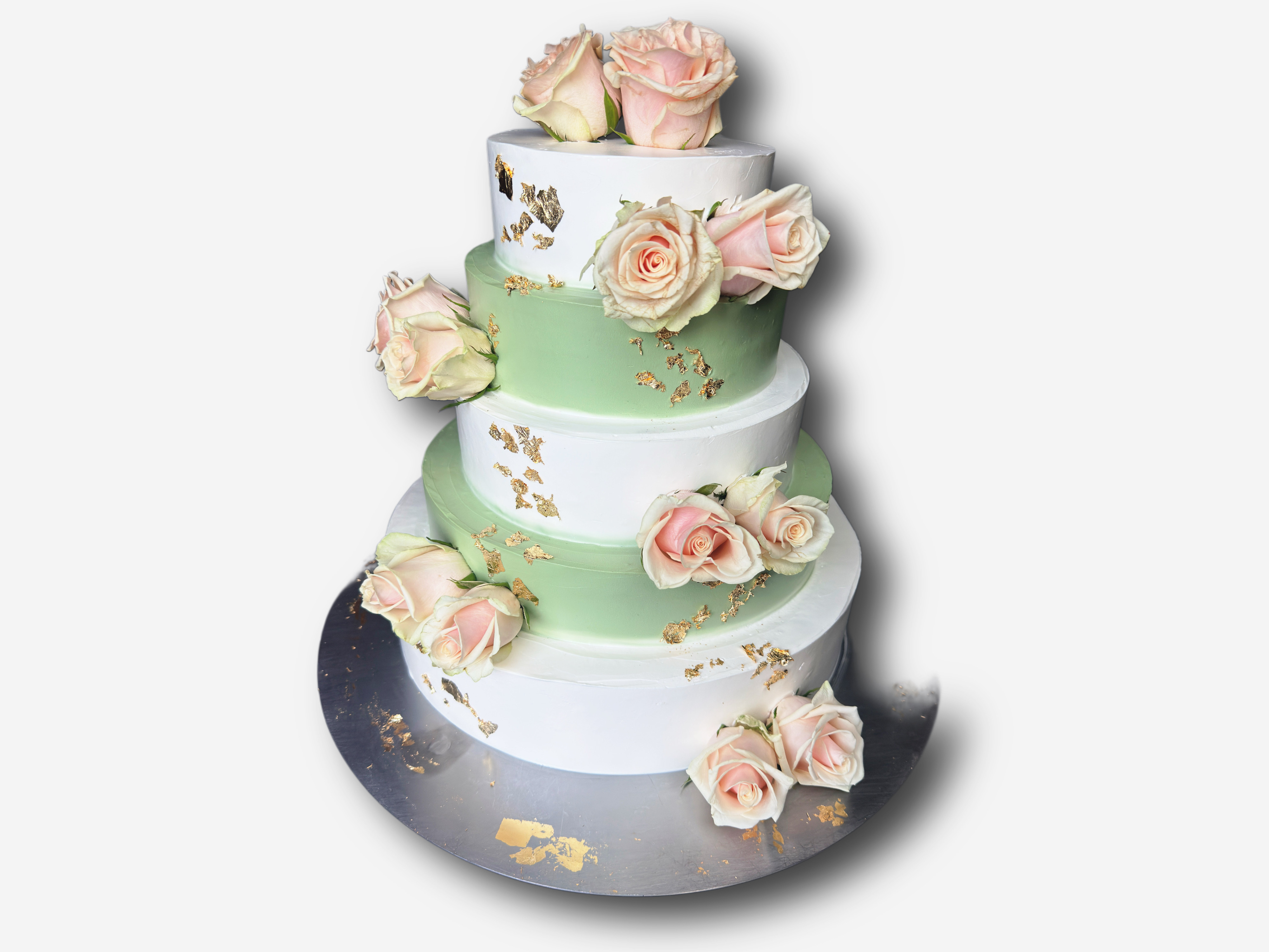 Tort utrzymany w eleganckiej, pastelowej kolorystyce bieli i delikatnej zieleni. Każde piętro zdobią subtelne złote akcenty w postaci jadalnych płatków złota, które dodają całości luksusowego charakteru. Kompozycje dopełniają świeże róże w odcieniach pudrowego różu, rozmieszczone na poszczególnych piętrach, nadając tortowi romantycznego i naturalnego uroku. To idealny na wesele.