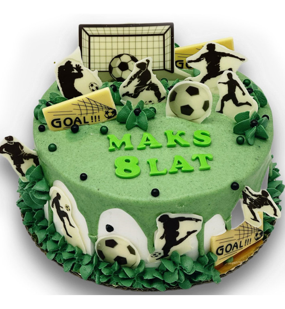 Tort dekorowany figurkami piłki nożnej. Figurki wydrukowane na białej czekoladzie. W ten sposób udekorowany tort zachwyci każdego chłopca.