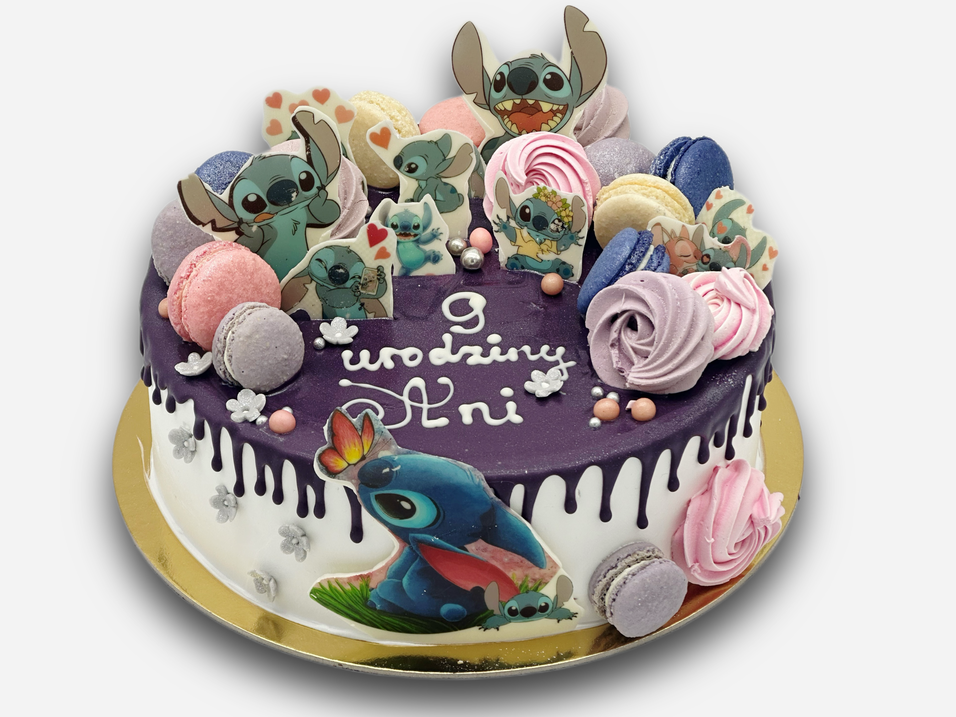 Tort dekorowany figurkami Stich. Figurki wydrukowane na białej czekoladzie.