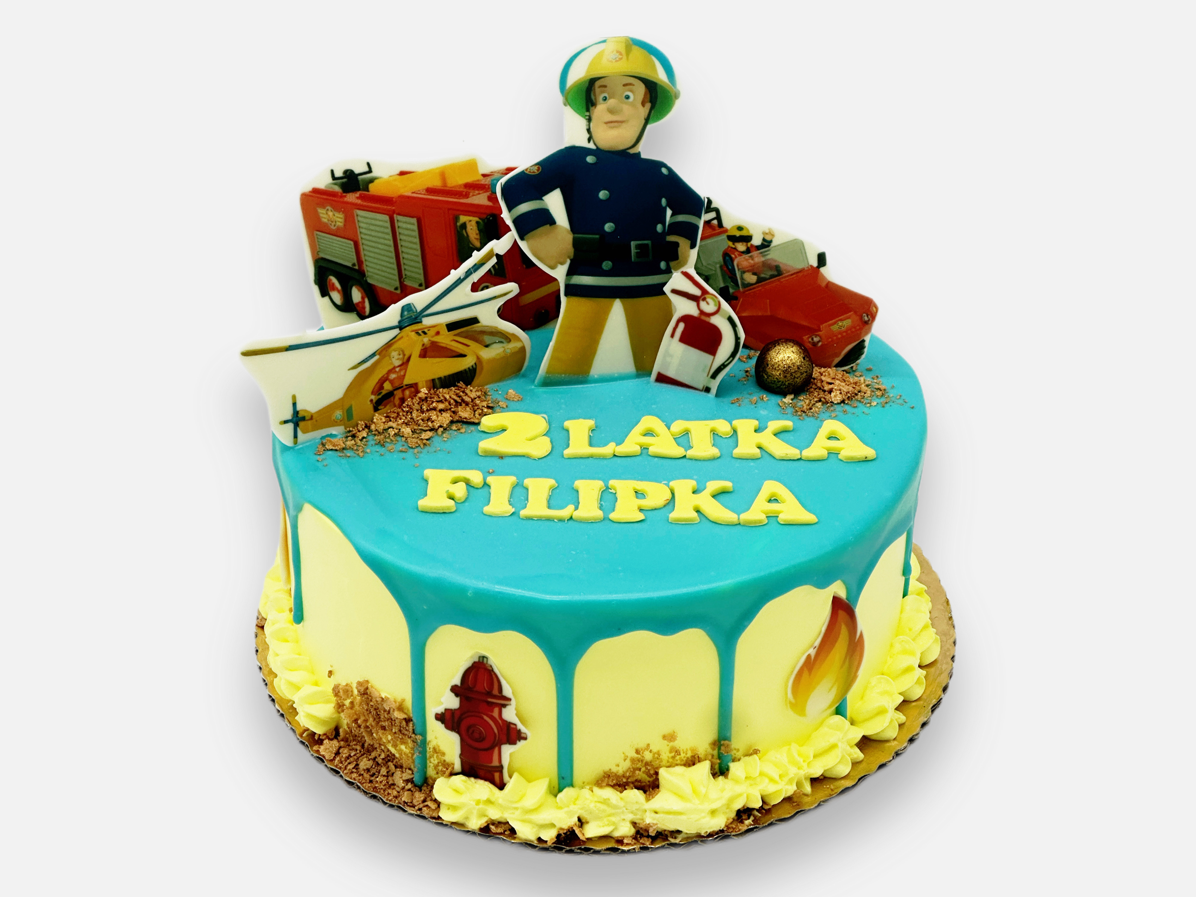 Tort dekorowany figurkami z bajki Strażak Sam wydrukowanymi na białej czekoladzie. Figurki wydrukowane na białej czekoladzie.