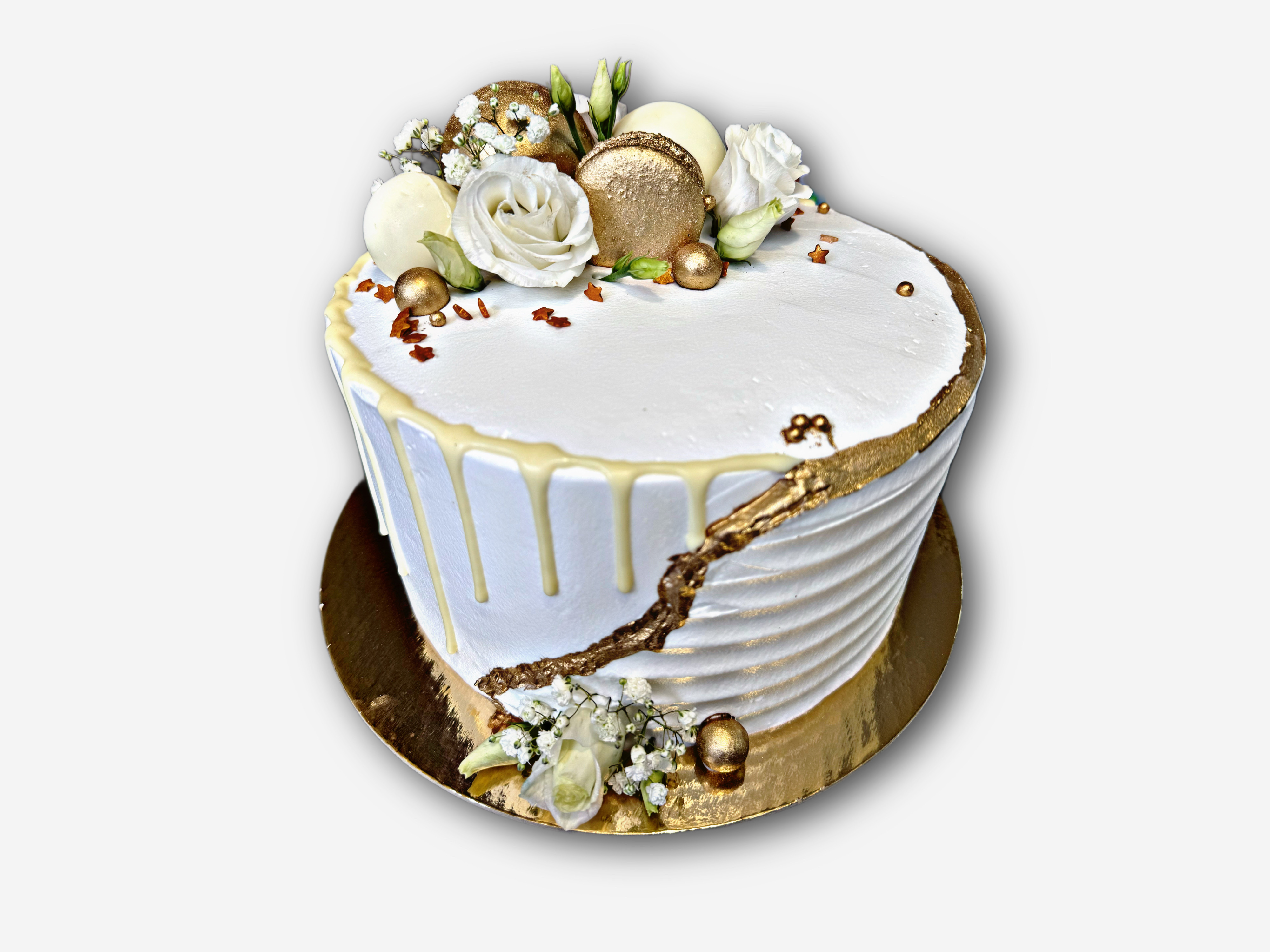 Delikatny tort w bieli wyższy z nowoczesnym złotym dripem i delikatną kompozycją kwiatową oraz akcentami w odcieniach złota. Elegancki, lekki i bardzo stylowy. Klasyka z nutą luksusu.